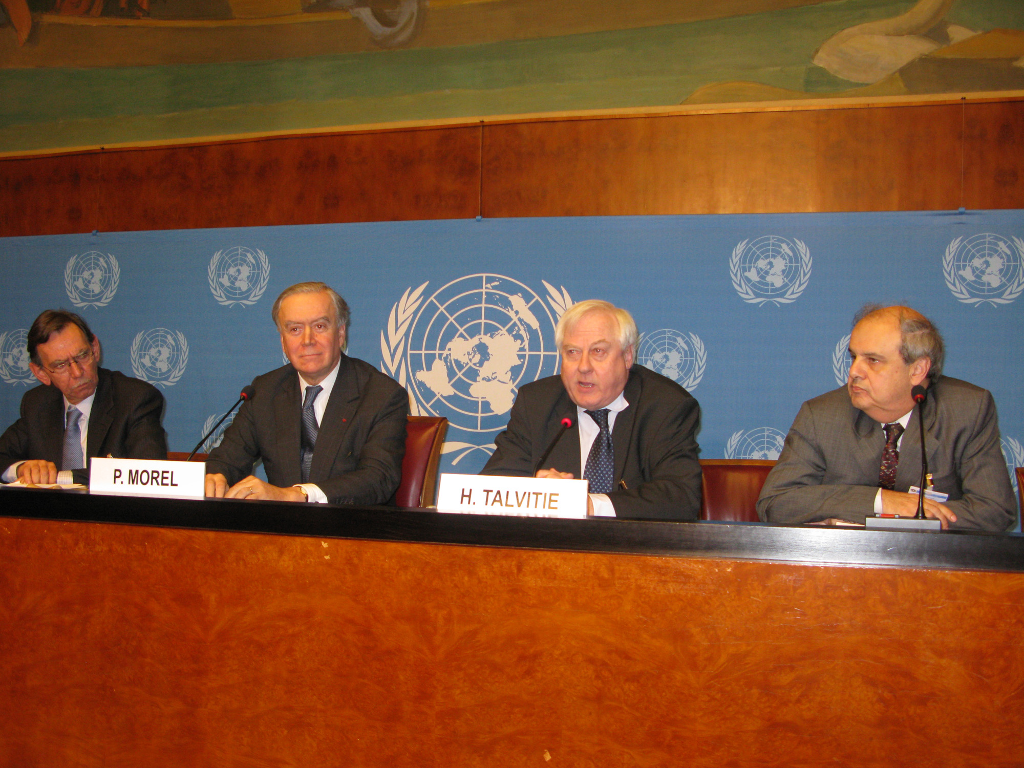 Ambassador Heikki Talvitie (2nd R), the Special Envoy of the OSCE Chairman-in-Office, addresses a press conference in Geneva, 18 December 2008. Also pictured (L-R): Johan Verbeke (UN), Pierre Morel (EU) and Charalampos Christopoulos (Greek Special Envoy).