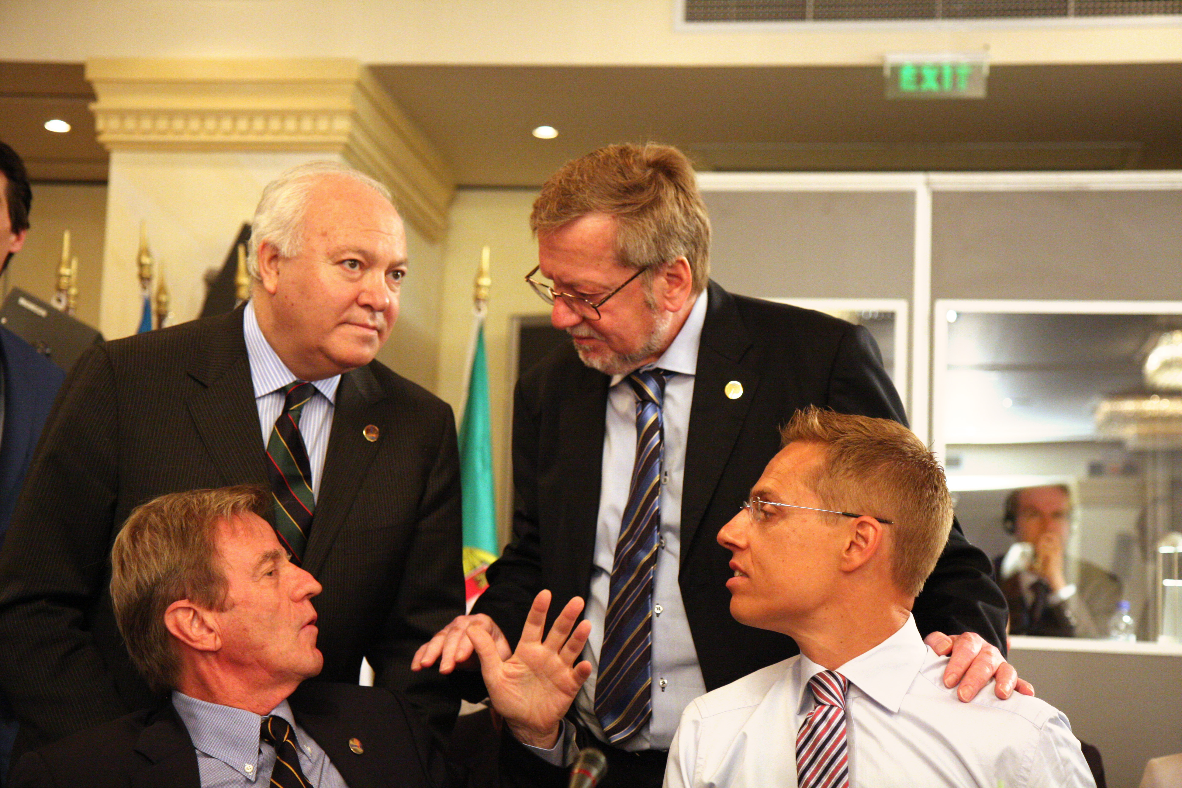 Clockwise from top left: Foreign Ministers Miguel Moratinos (Spain), Per Stig Moller (Denmark), Bernard Kouchner (France) and Alexander Stubb (Finland) talk just before the informal meeting of OSCE foreign ministers. Corfu, Greece 28 June 2009.