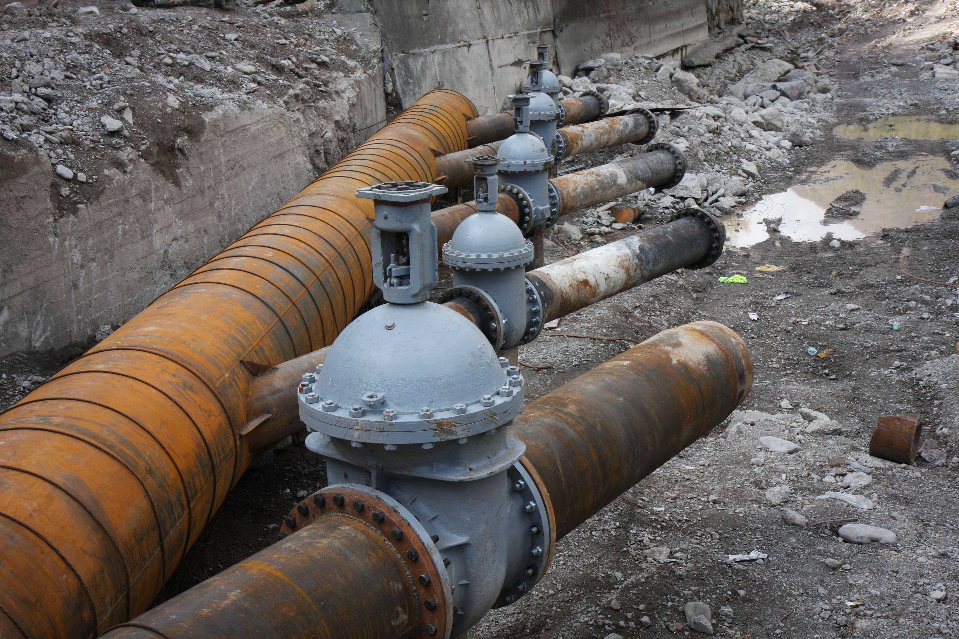 From each of the two pipes a set of smaller pipes are affixed, on which gate valves are welded. Water for irrigation flows through the pipes seen here.