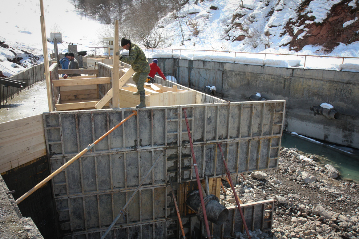 Within three months the left wing was entirely rebuilt. This also required building a concrete monolith to cement the pipes and valves, to prevent them from vibration that can happen in case of a powerful water discharge.