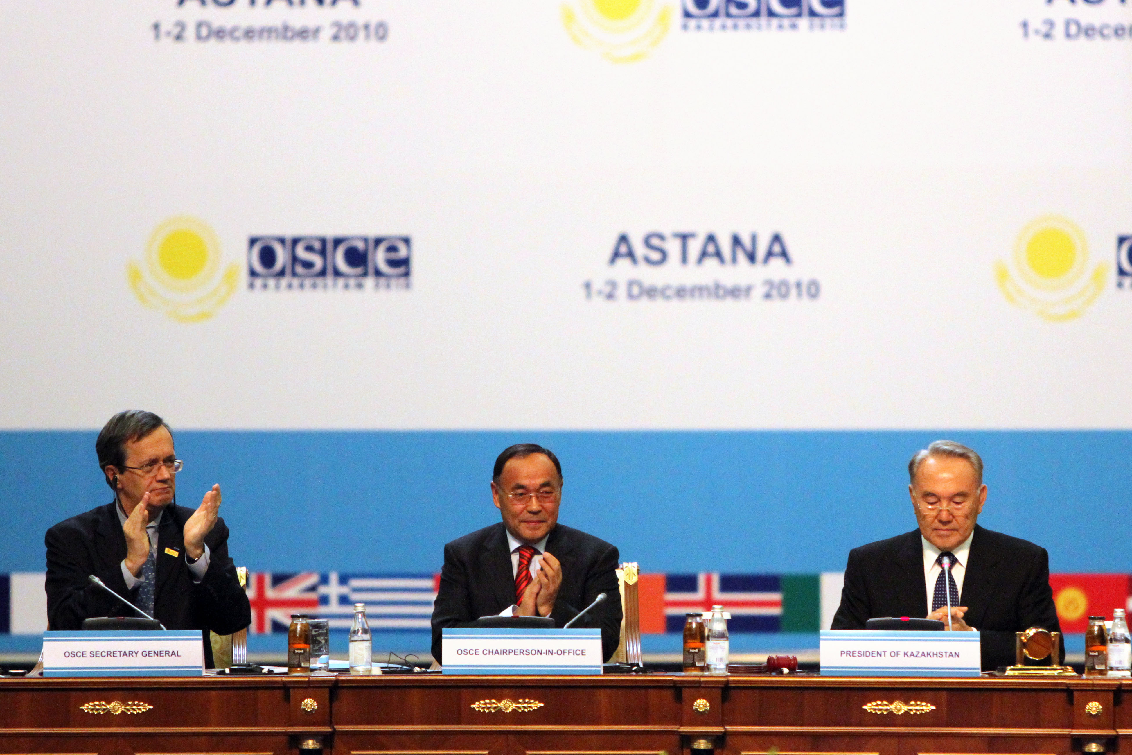 (de izq. a der.): El Secretario General de la OSCE, Marc Perrin de Brichambaut; el Presidente en Ejercicio de la OSCE, Kanat Saudabayev, Ministro de Asuntos Exteriores de Kazajstán; y el Presidente de Kazajstán, Nursultan Nazarbayev, en la sesión de clausura de la Cumbre de la OSCE en Astana, 2 de diciembre de 2010.