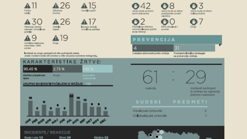 Infografika prikazuje statistiku o incidentima mržnje u Bosni i Hercegovini, s grafikonima i mapom.