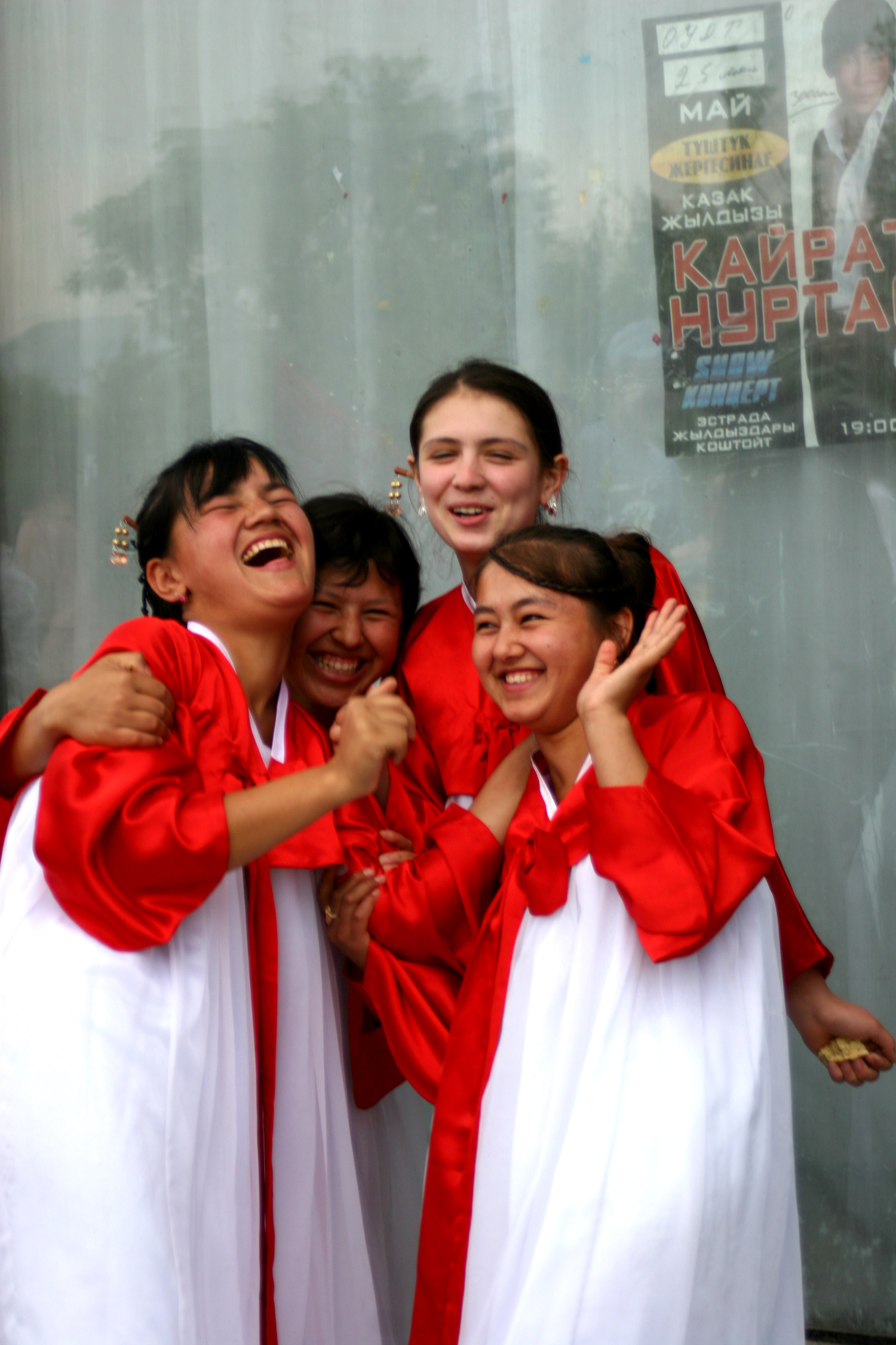 Girls in national costumes have fun at the award ceremony for 'The Colours of Friendship' drawing competition held by the HCNM-supported Centre for Multilingual and Multicultural Education, Osh, Kyrgyzstan, 1 June 2008.