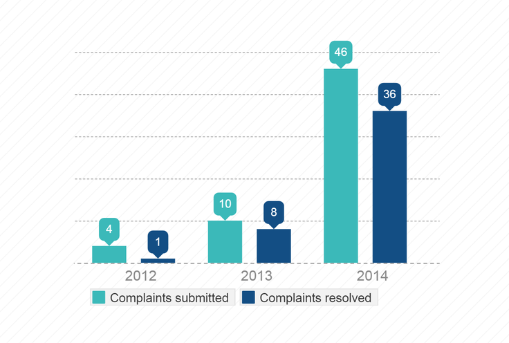 In the first year of operation the Office received a total of four complaints. In 2013 that number rose to ten. As the Office grew stronger and its promotion increased, the number of complaints in the first half of 2014 reached 46. An encouraging sign is that 36 cases have already been resolved in favor of plaintiffs.