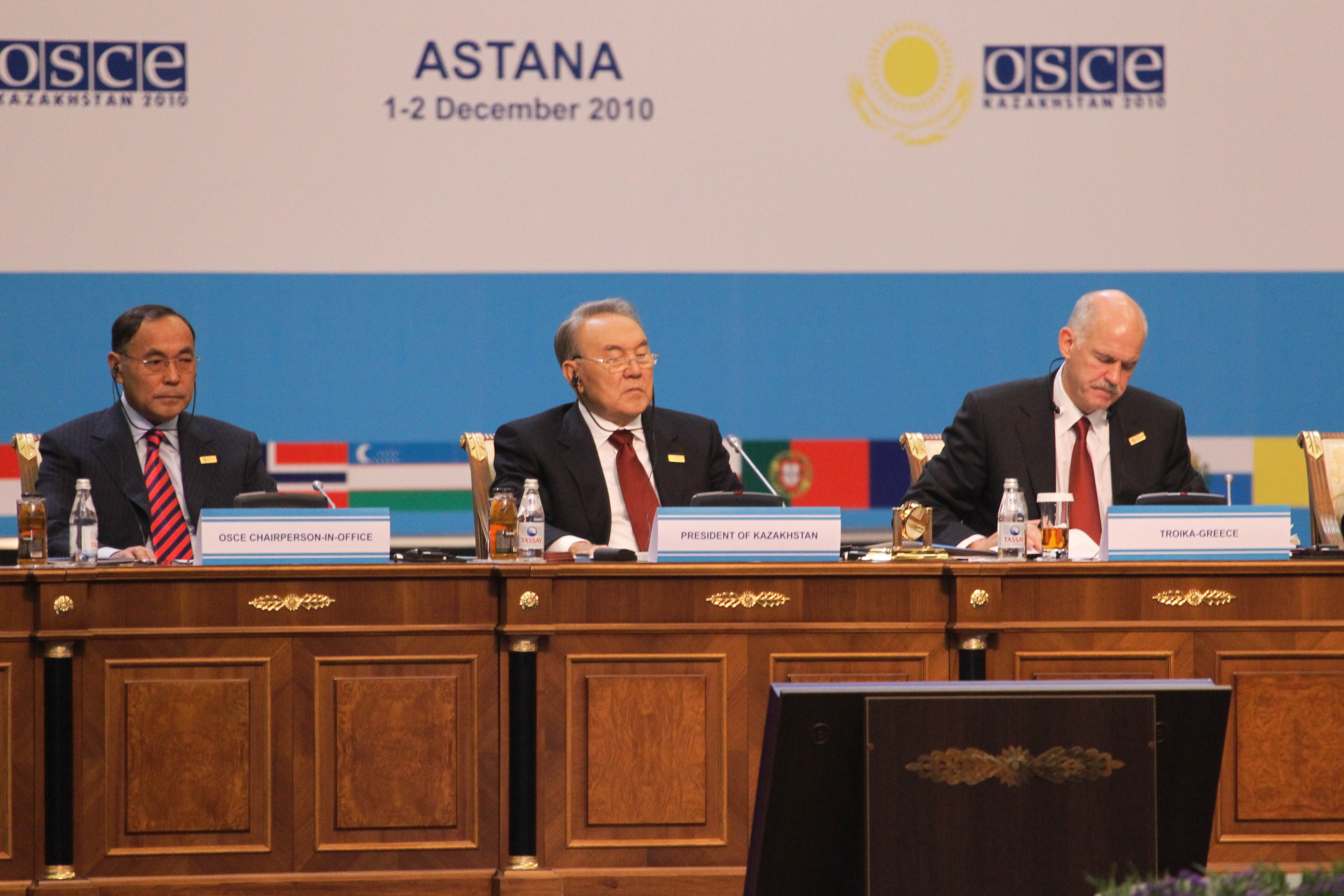 L-r: OSCE Chairperson-in-Office and Kazakhstan's Foreign Minister Kanat Saudabayev, President of Kazakhstan Nursultan Nazarbayev, and Prime Minister of Greece George Papandreou, Astana, 1 December 2010.