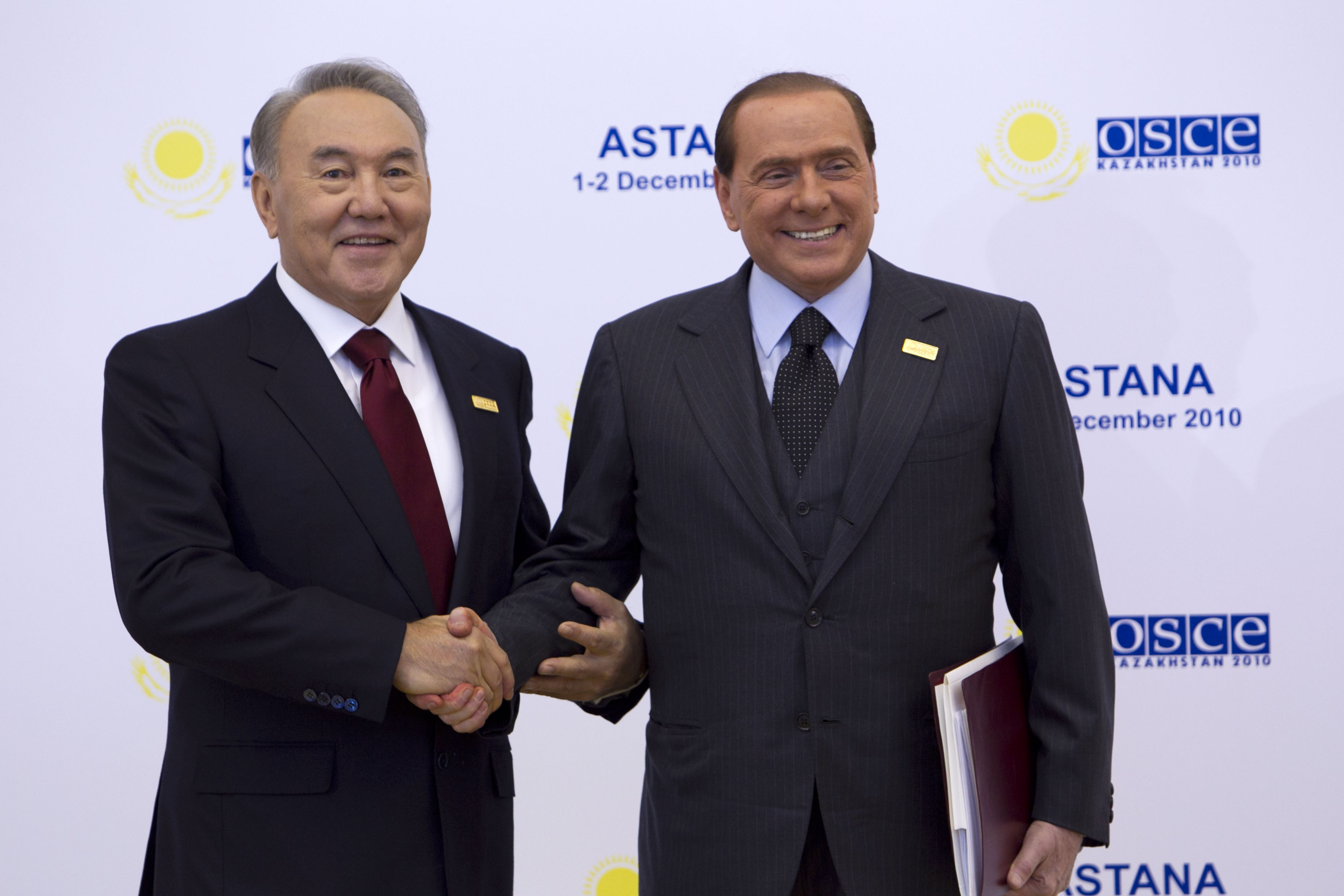 Silvio Berlusconi, Prime Minister of Italy, is greeted by Kazakhstan’s President Nursultan Nazarbayev at the opening of the OSCE Summit in Astana, 1 December 2010.