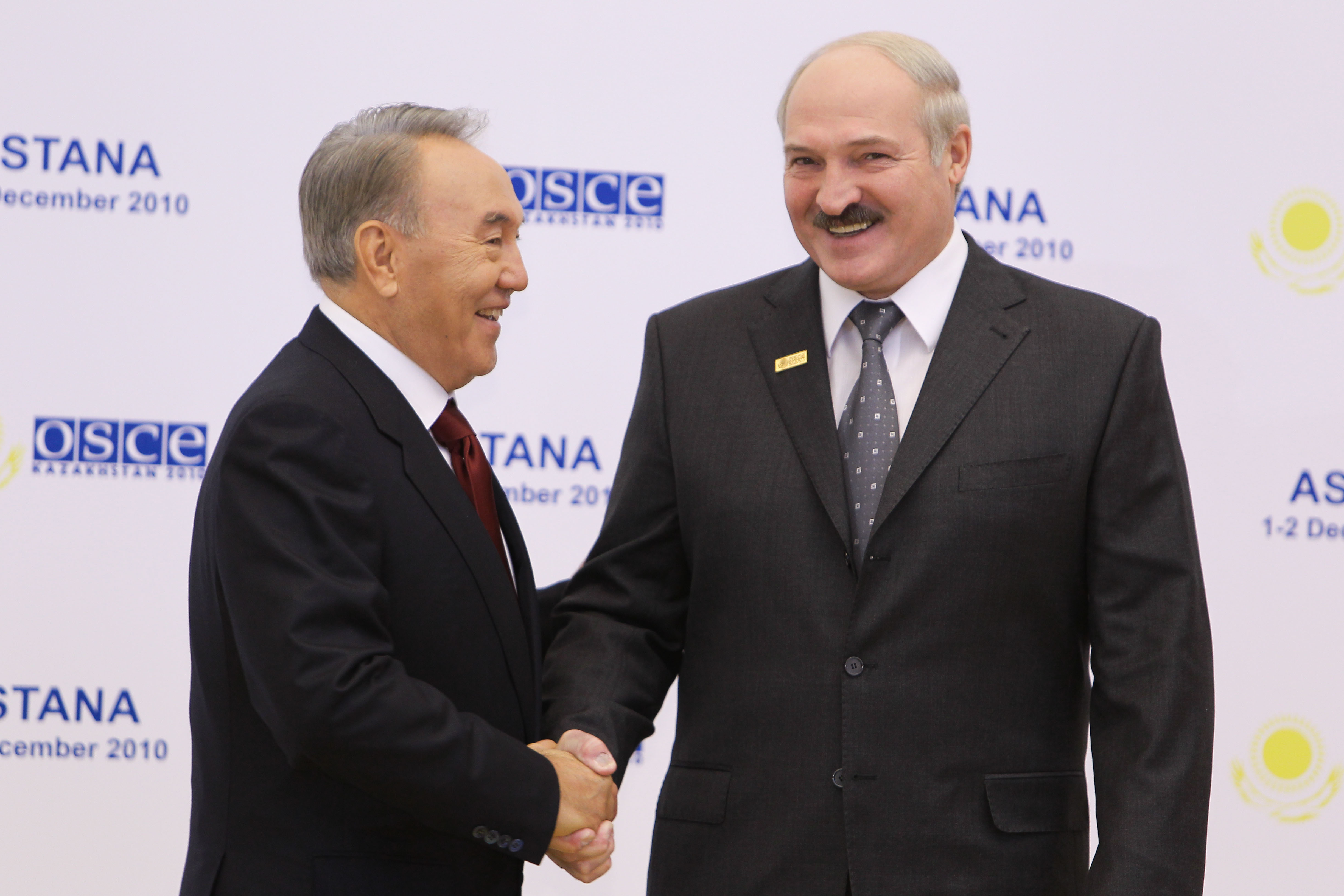 Alexander Lukashenko, President of Belarus, is greeted by Kazakhstan’s President Nursultan Nazarbayev at the opening of the OSCE Summit in Astana, 1 December 2010.
