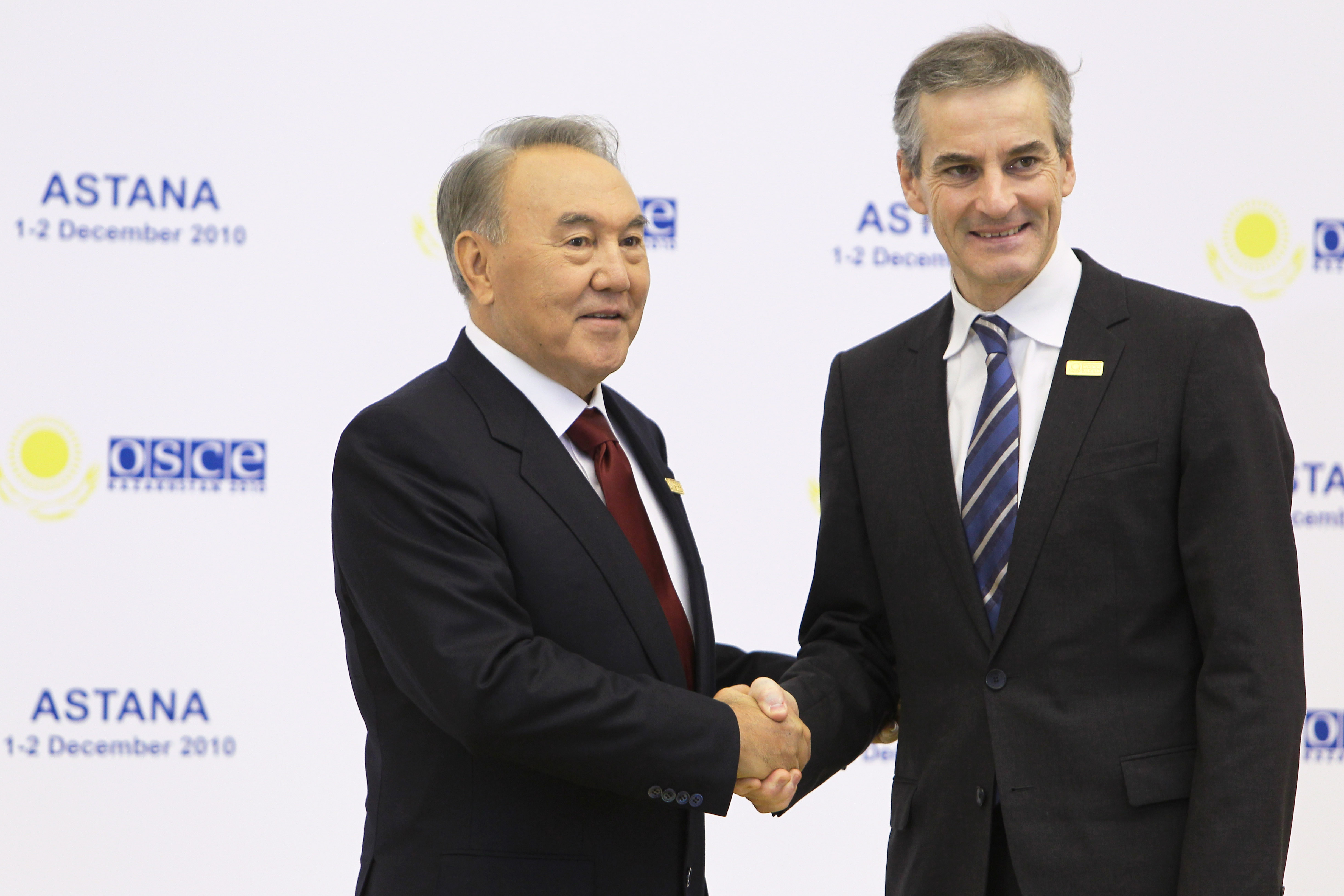 Jonas Gahr Støre, Minister of Foreign Affairs of Norway, is greeted by Kazakhstan’s President Nursultan Nazarbayev at the opening of the OSCE Summit in Astana, 1 December 2010.