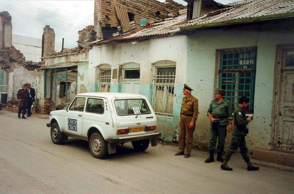 Mission to Georgia, 1993. Members of the CSCECSCE Conference on Security and Co-operation in Europe Mission to Georgia inspect areas of conflict in the region of South Ossetia.