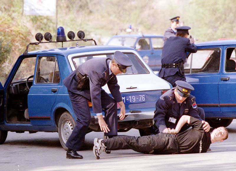 Mission to Serbia, 2001: Newly trained police officers demonstrate their skills at a police graduation ceremony in Mitrovo Polje, southern Serbia. The OSCE Mission to Serbia helps train the country’s police forces. 17 October 2001.