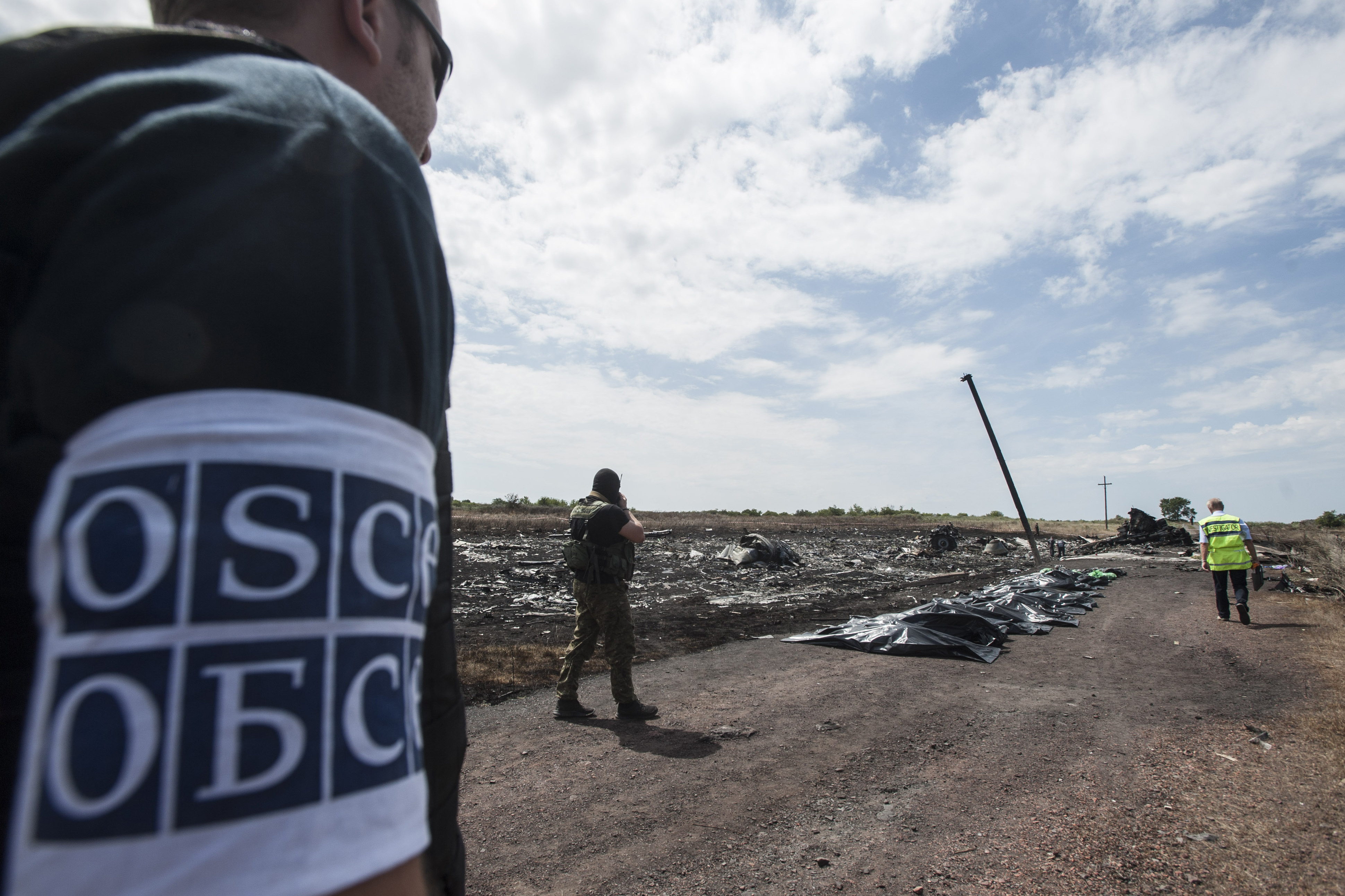 OSCE Special Monitoring Mission to Ukraine, 2014: An OSCE monitor looks on as body bags are arranged on the side of the road at the crash site of Malaysia Airlines Flight 17, which was downed over eastern Ukraine on 17 July 2014.