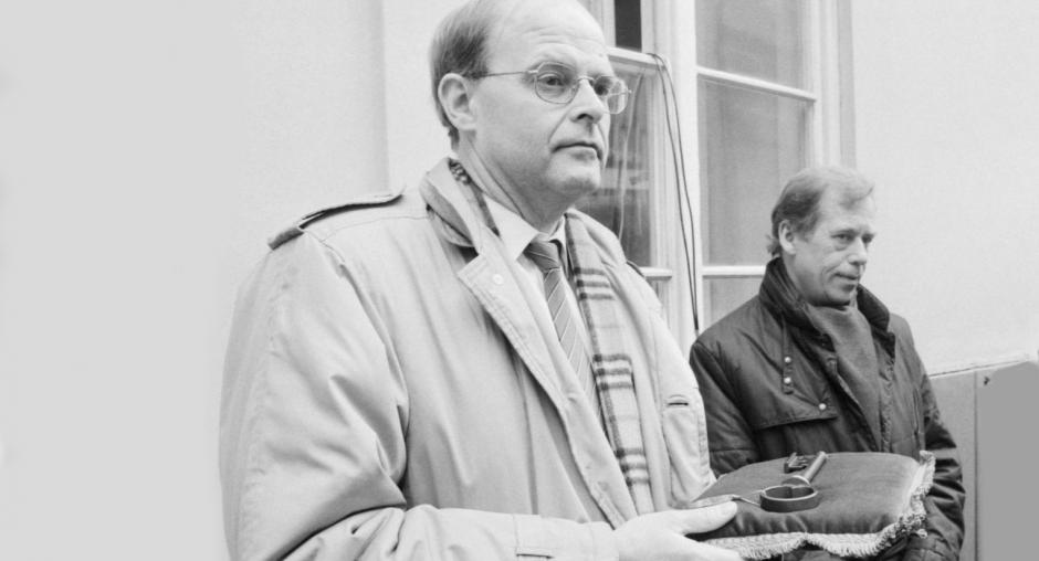 Nils Eliasson, first Director of the CSCECSCE Conference on Security and Co-operation in Europe Secretariat, with Czechoslovakia’s President Václav Havel at the official opening of the Secretariat first premises. Prague, February 1991.