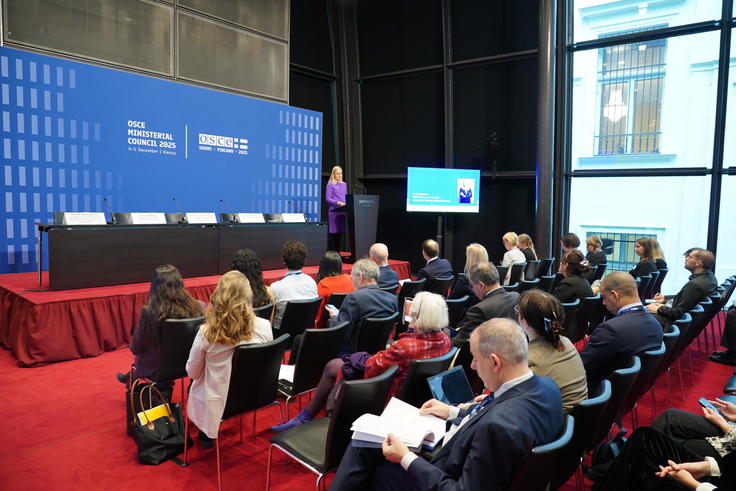 OSCE Chairperson-in-Office, Minister for Foreign Affairs of Finland Elina Valtonen addresses side event at the 32nd OSCE Ministerial Council in Vienna, 4 December 2025.