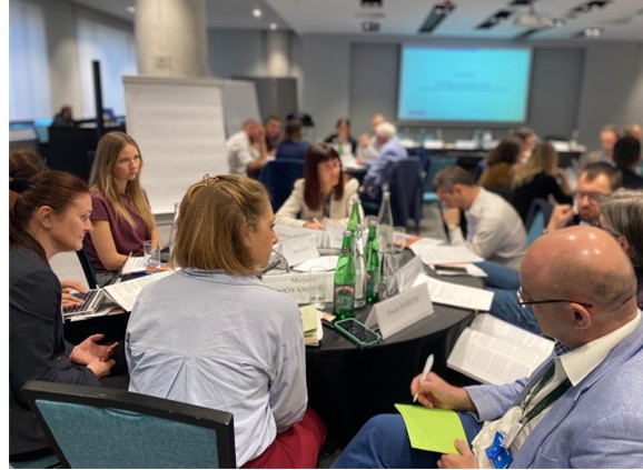 People seated around tables in a conference room, discussing and taking notes.