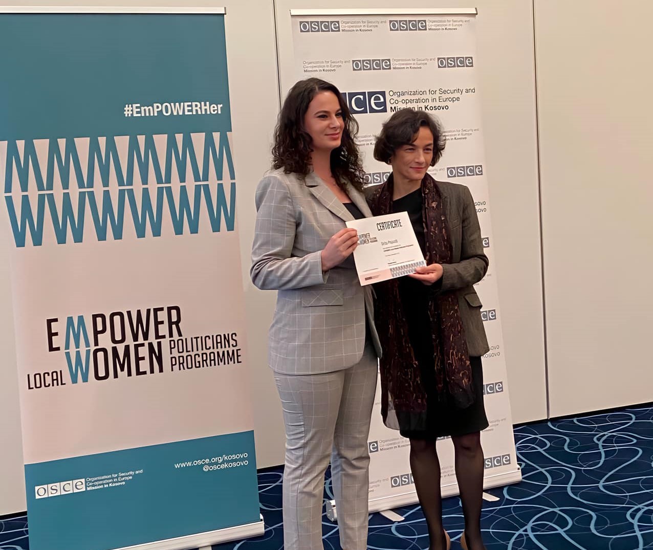 MP Drita Pajaziti receives her certificate of completion for the EmPOWER programme from OSCE Democratization Department Director Pascale Roussy. Prishtinë/Priština, November 2023.