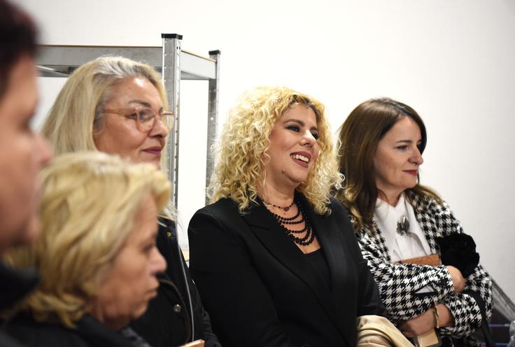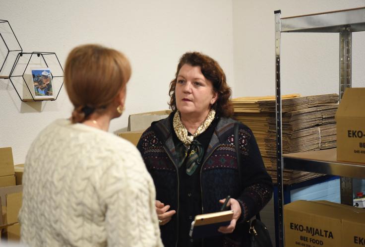 Igballe Zogiani from Harilaç/Ariljača village, Fushë Kosovë/Kosovo Polje municipality, engages in conversation with Ardita on business management and incorporating her advices into her own work. 5 November 2025 (OSCE/Leurina Mehmeti)