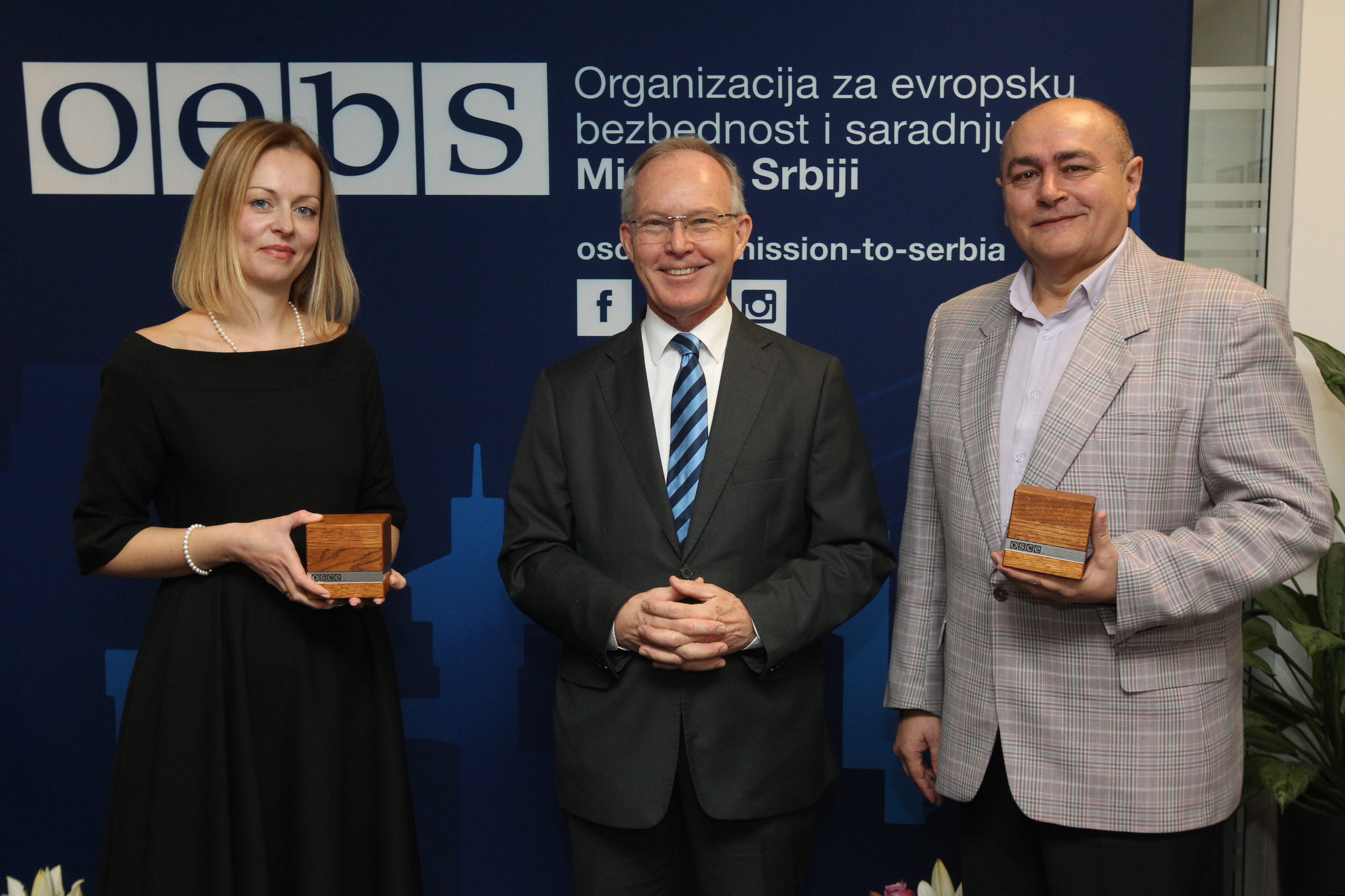 Ambassador Jan Braathu (centre) with the winners of the 2023 OSCE Mission to Serbia Person of the Year Award, Belgrade, 7 December 2023.