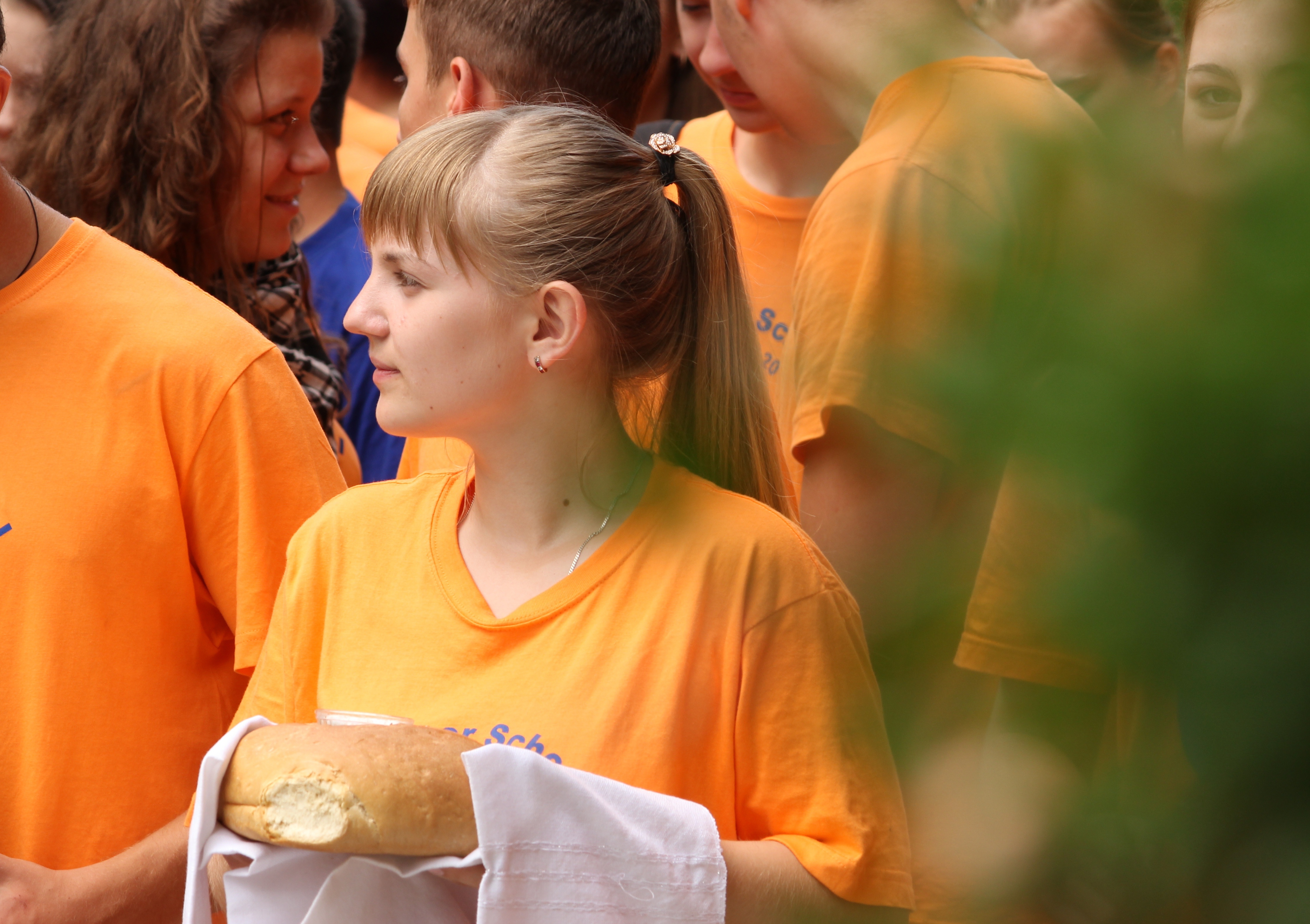 Participants of the Summer School welcoming the newcomers to “Nistru” Camp in a traditional way with bread and salt, Molovata Noua, Dubassary, 20 July 2014.