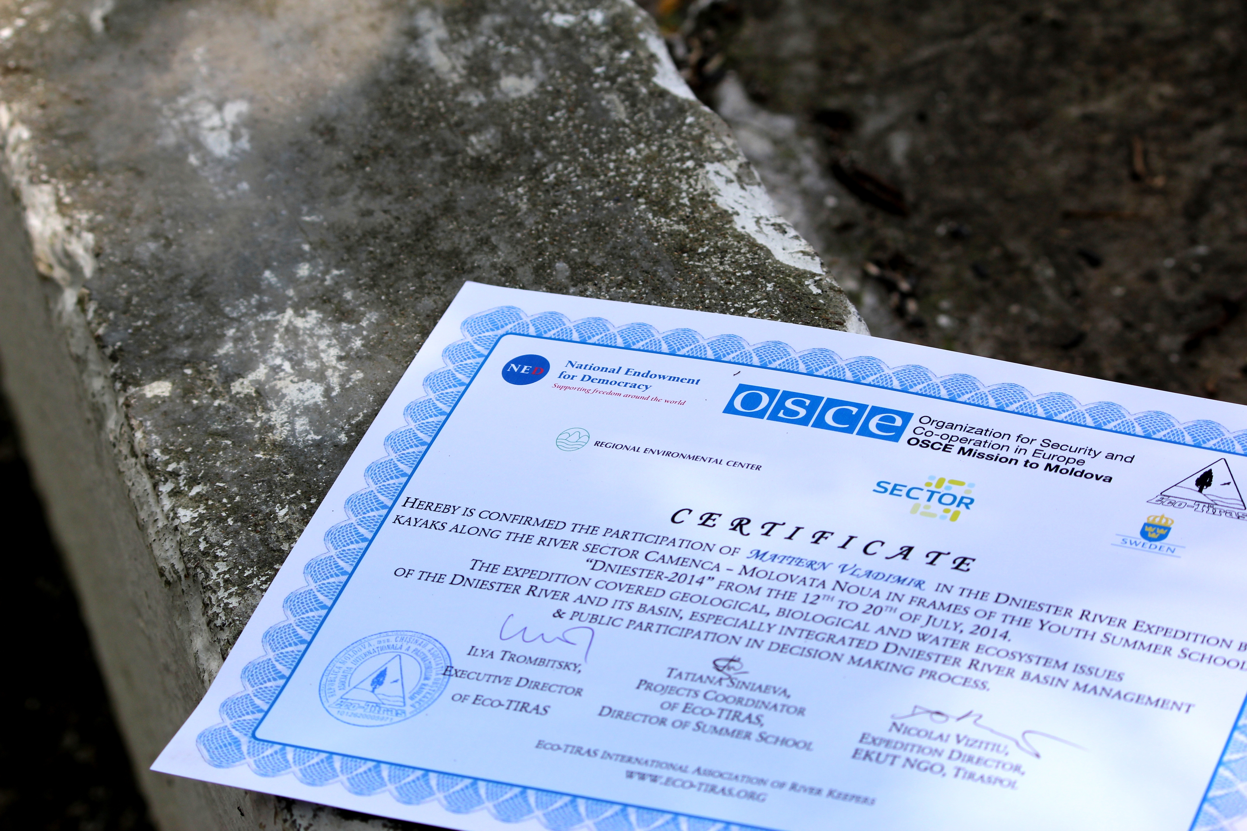 Certificate for the participants at the Summer School. “It is equally important that young people learn how to preserve this river for future generations”, said Maurice Dunand from the OSCE Mission to Moldova, Molovata Noua, 20 July 2014.