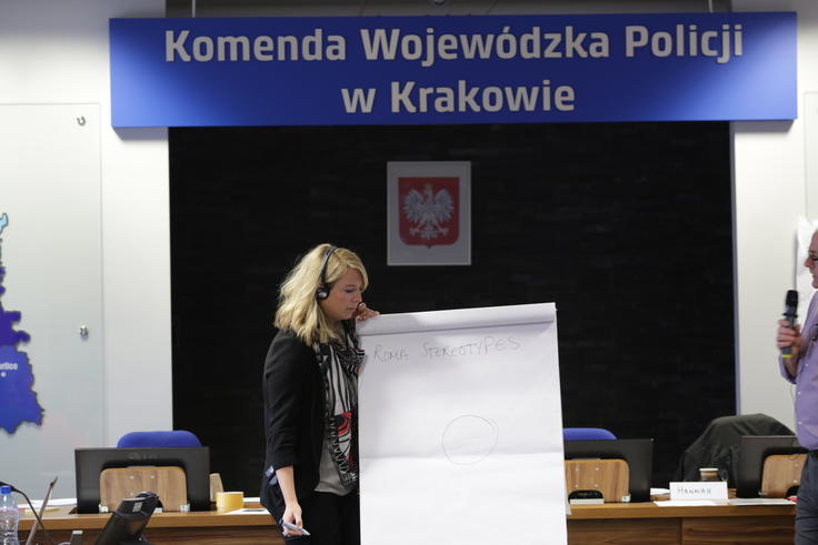 ODIHR trainer Hannah Lawton, of Gwent Police in the United Kingdom, during a course on effective and human rights-compliant policing in Roma and Sinti communities delivered to a group of Polish police officers in Krakow. 27 April 2017.