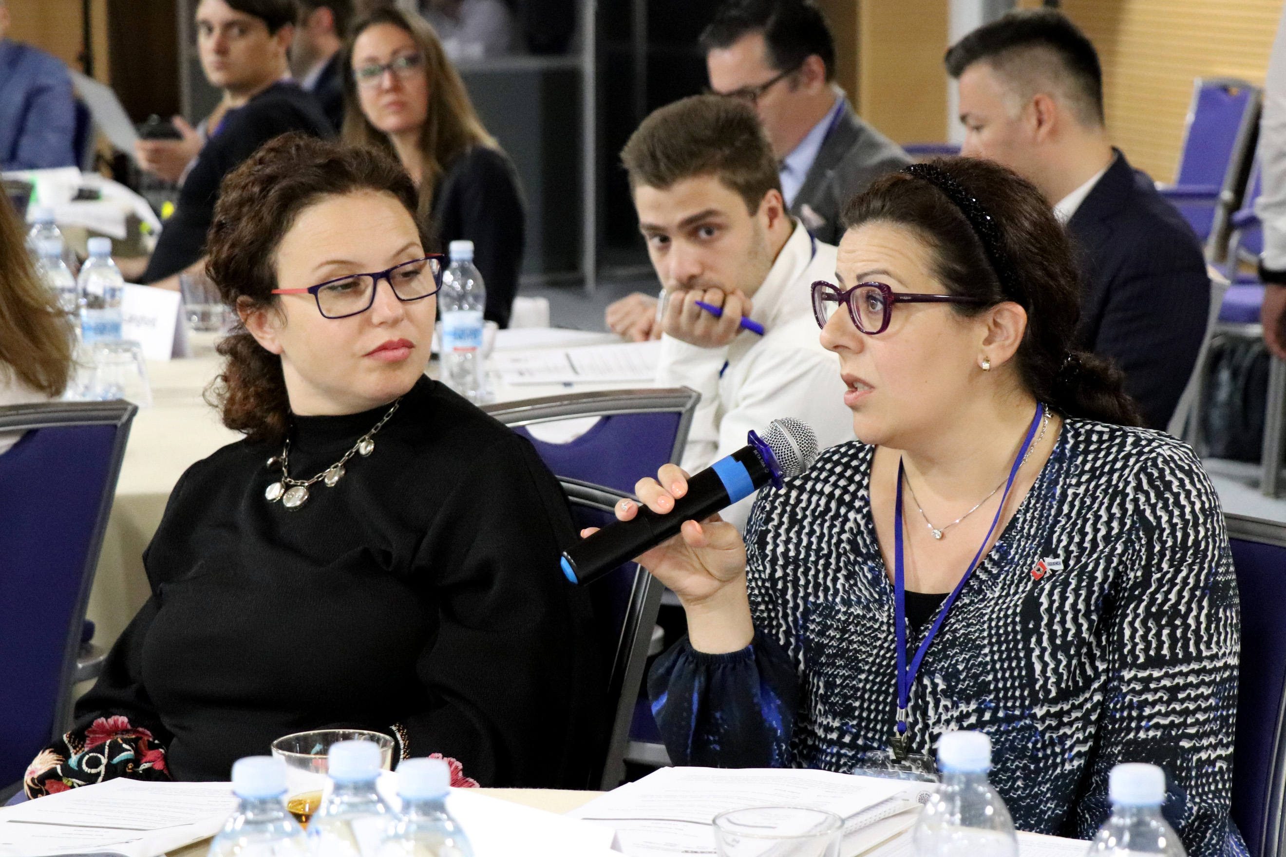 Ama Kraja (left) and Iris Petrela (right) from the OSCE Presence in Albania contribute to the OSCE's annual trial monitoring meeting. Kyiv, 12 June.