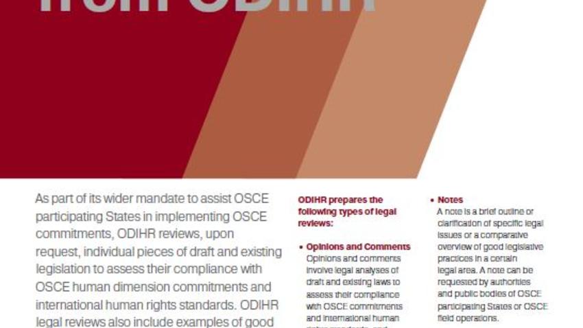 As part of its wider mandate to assist OSCE participating States in implementing OSCE commitments, ODIHR reviews, upon request, individual pieces of draft and existing legislation to assess their compliance with OSCE human dimension commitments and international human rights standards. ODIHR legal reviews also include examples of good practices from other OSCE participating States and provides concrete recommendations for improvement. In certain circumstances, ODIHR prepares reviews jointly with other OSCE structures and international organizations, notably the Council of Europe’s Commission for Democracy through Law (Venice Commission).