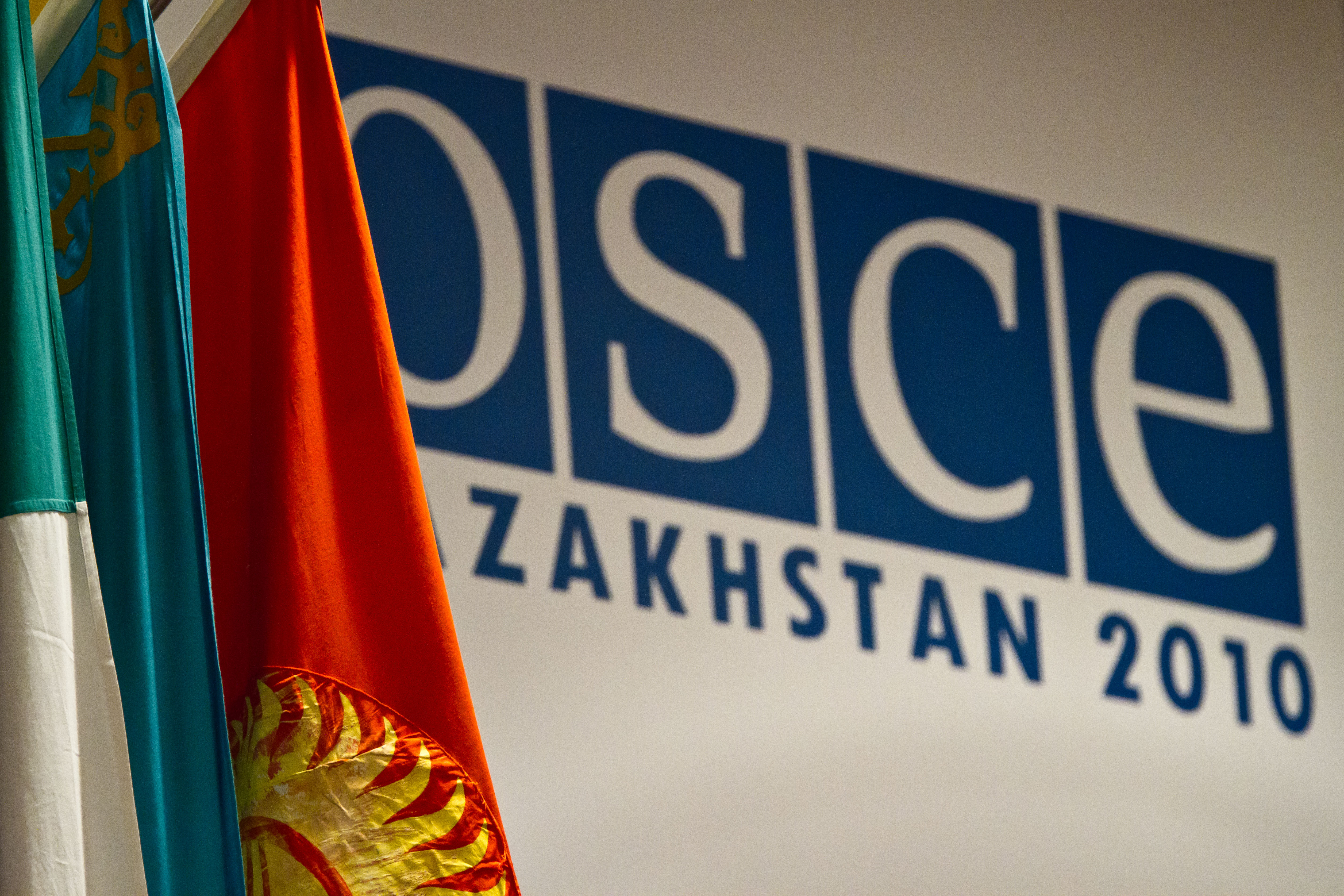 The flags of several OSCE states hang next to the banner of the current chairmanship, Kazakhstan, at the opening of the OSCE's Review Conference in Warsaw, Poland, 30 September 2010. The conference will continue later this year in Vienna and Astana.