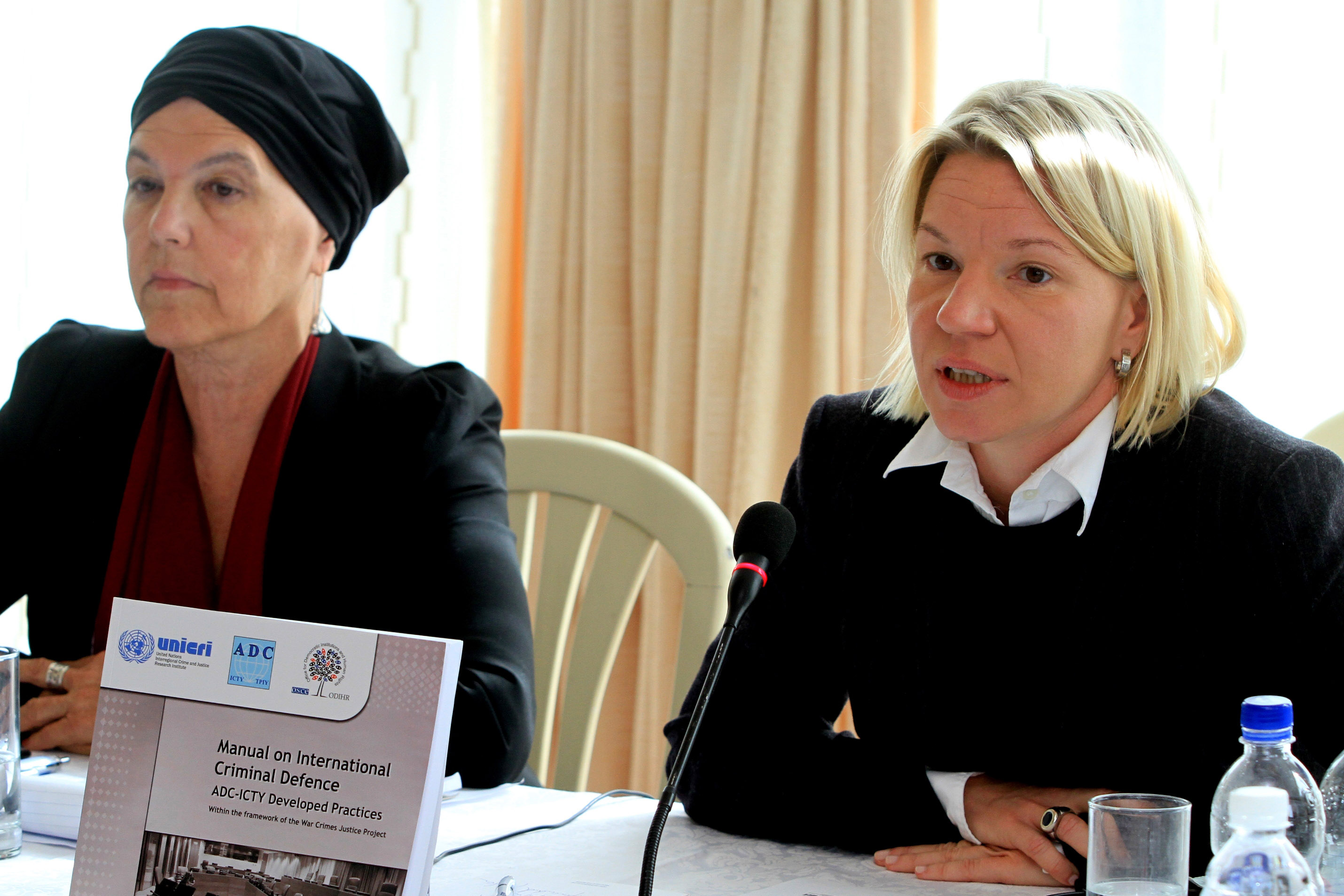 Colleen Rohan, Defence Counsel at the International Criminal Tribunal for the former Yugoslavia (l) and Romana Schweiger, War Crimes Justice Project (WCJP) Regional Co-ordinator, lead an advocacy-skills training session for defence lawyers appearing in war crimes cases as part of the WCJP, Prishtinë/Priština, 19 October 2011.