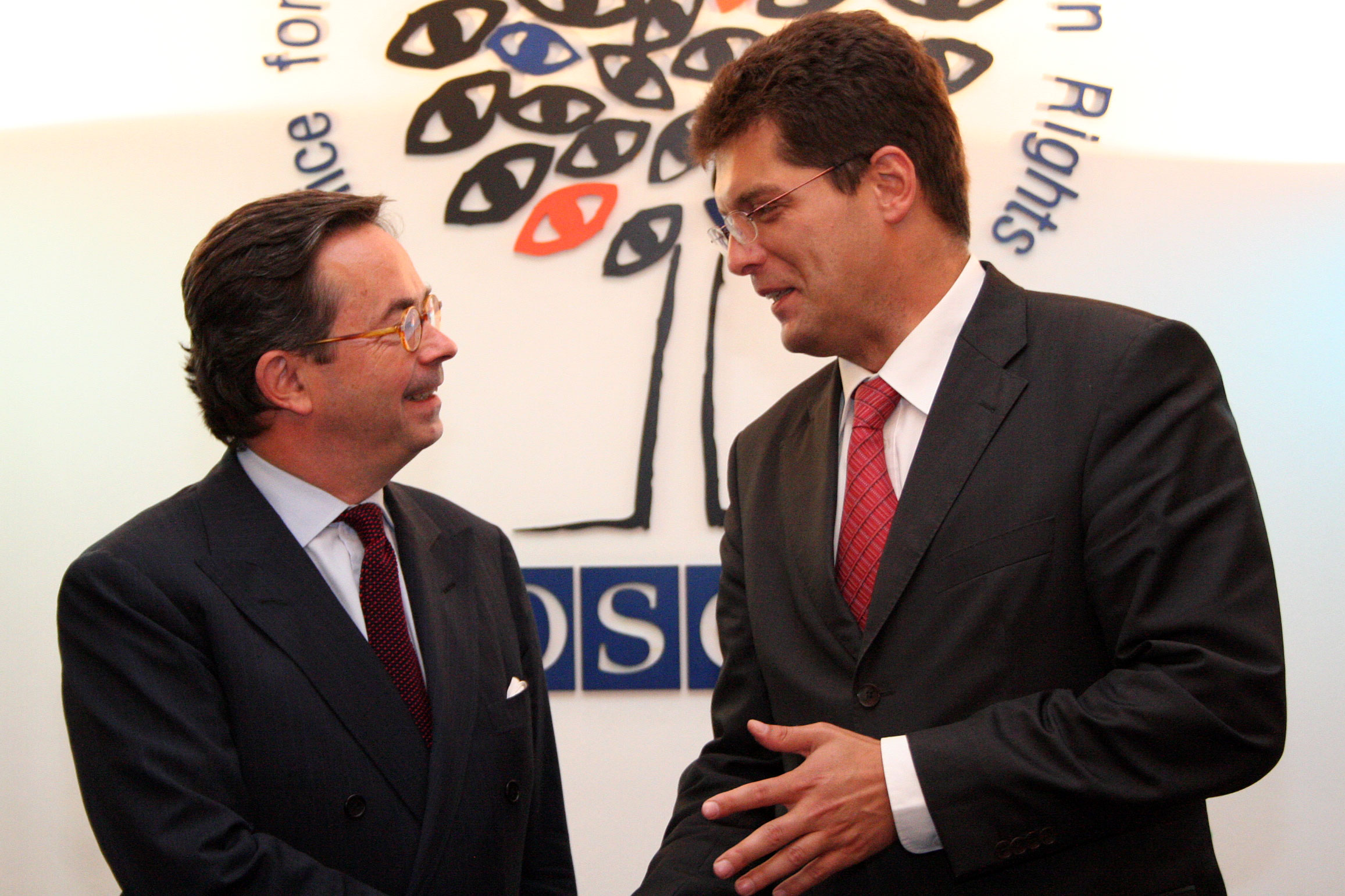 Outgoing ODIHR Director Ambassador Christian Strohal (left) with his successor, Ambassador Janez Lenarcic (right), 9 June 2008. Lenarcic took over the job on 1 July.
