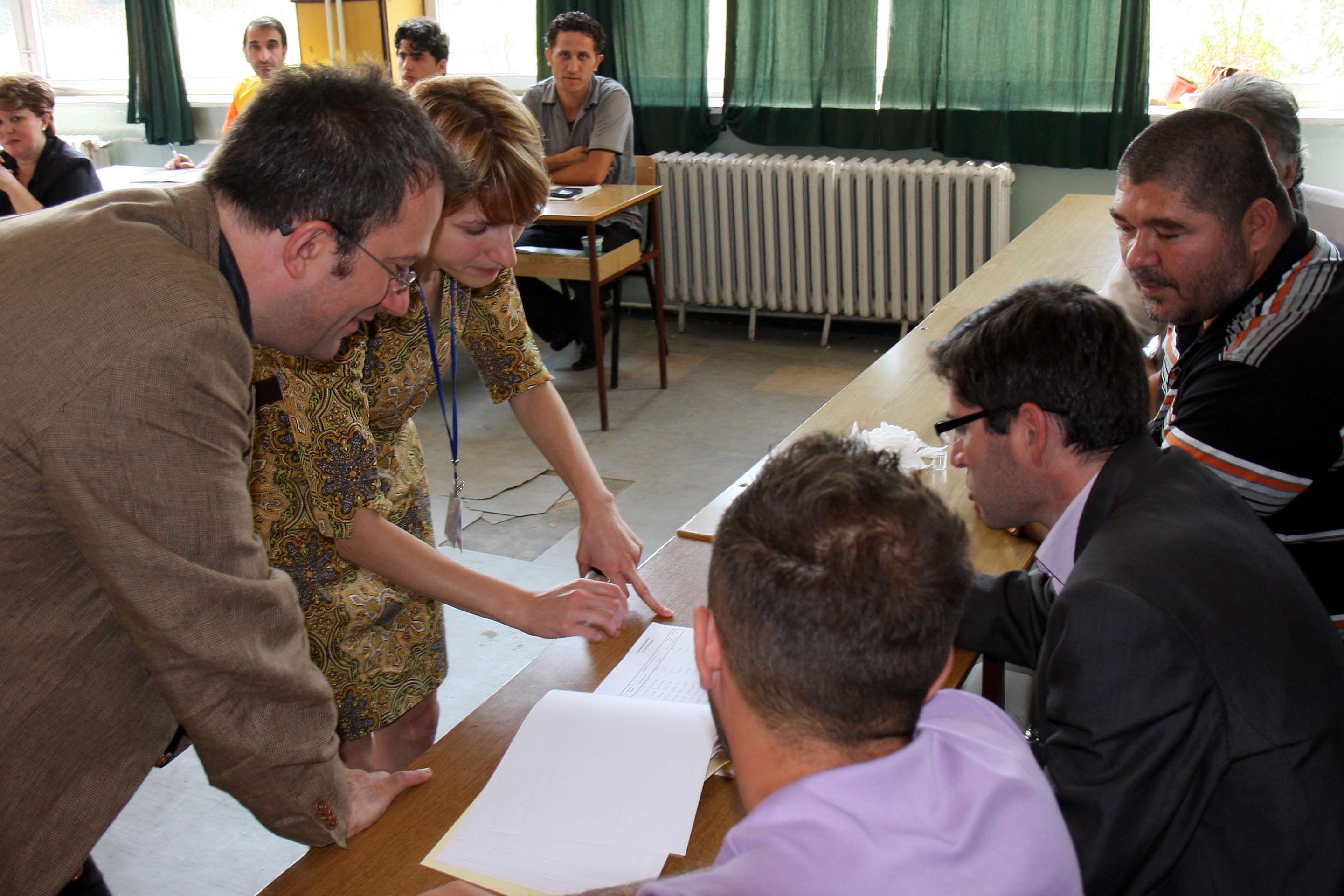 OSCE observers check the voter list during re-runs of the 1 June 2008 parliamentary elections in the former Yugoslav Republic of Macedonia, held on 15 June.