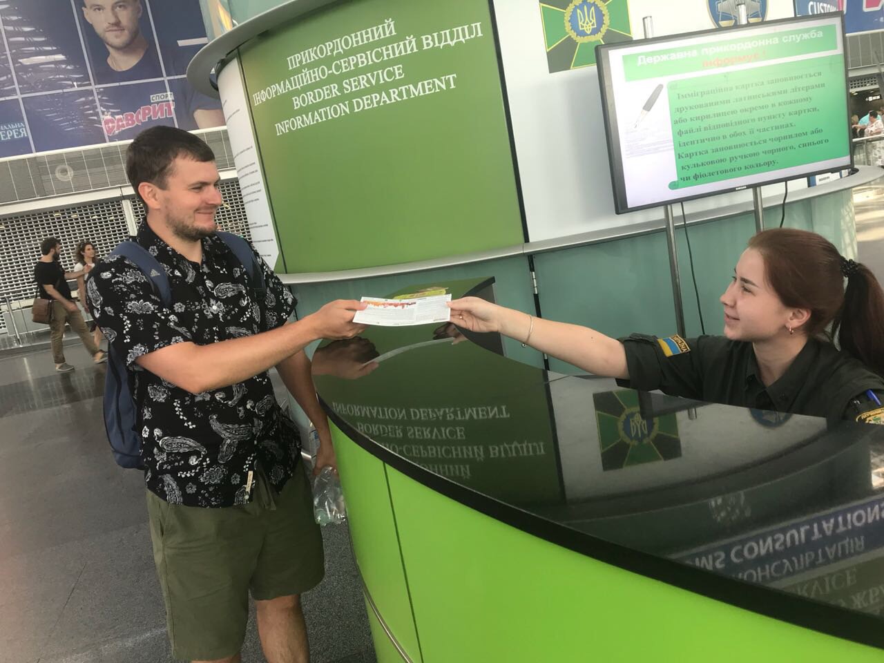 Ukrainian border guards distribute leaflets warning travelers about risks to become victims of traffickers as part of awareness-raising campaign supported by the OSCE Project Co-ordinator. 30 July 2018