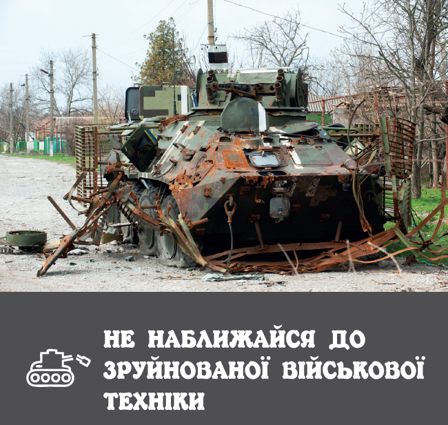 Curious to have a closer look at a destroyed tank or an armored personnel carrier? DO NOT APPROACH! “Previous owners” or those who destroyed it may have left booby traps, mines or improvised explosive devices! Beware of any military equipment as it may also contain a supply of shells or other munitions that can explode any moment!