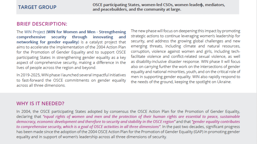 The WIN Project (WIN for Women and Men - Strengthening comprehensive security through innovating and networking for gender equality) is a catalyst project that aims to accelerate the implementation of the 2004 Action Plan for the Promotion of Gender Equality and to support OSCE participating States in strengthening gender equality as a key aspect of comprehensive security, making a difference in the lives of people across the region and beyond.