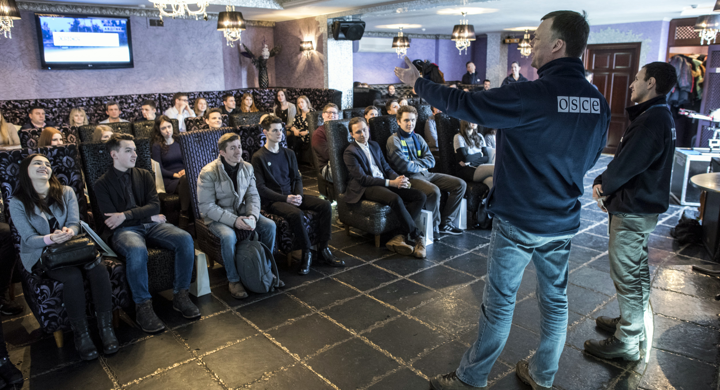 Первый заместитель Главы СММ ОБСЕ Александр Хуг общается с участниками ОБСЕ Café в Луганске, 16 февраля 2018 года.