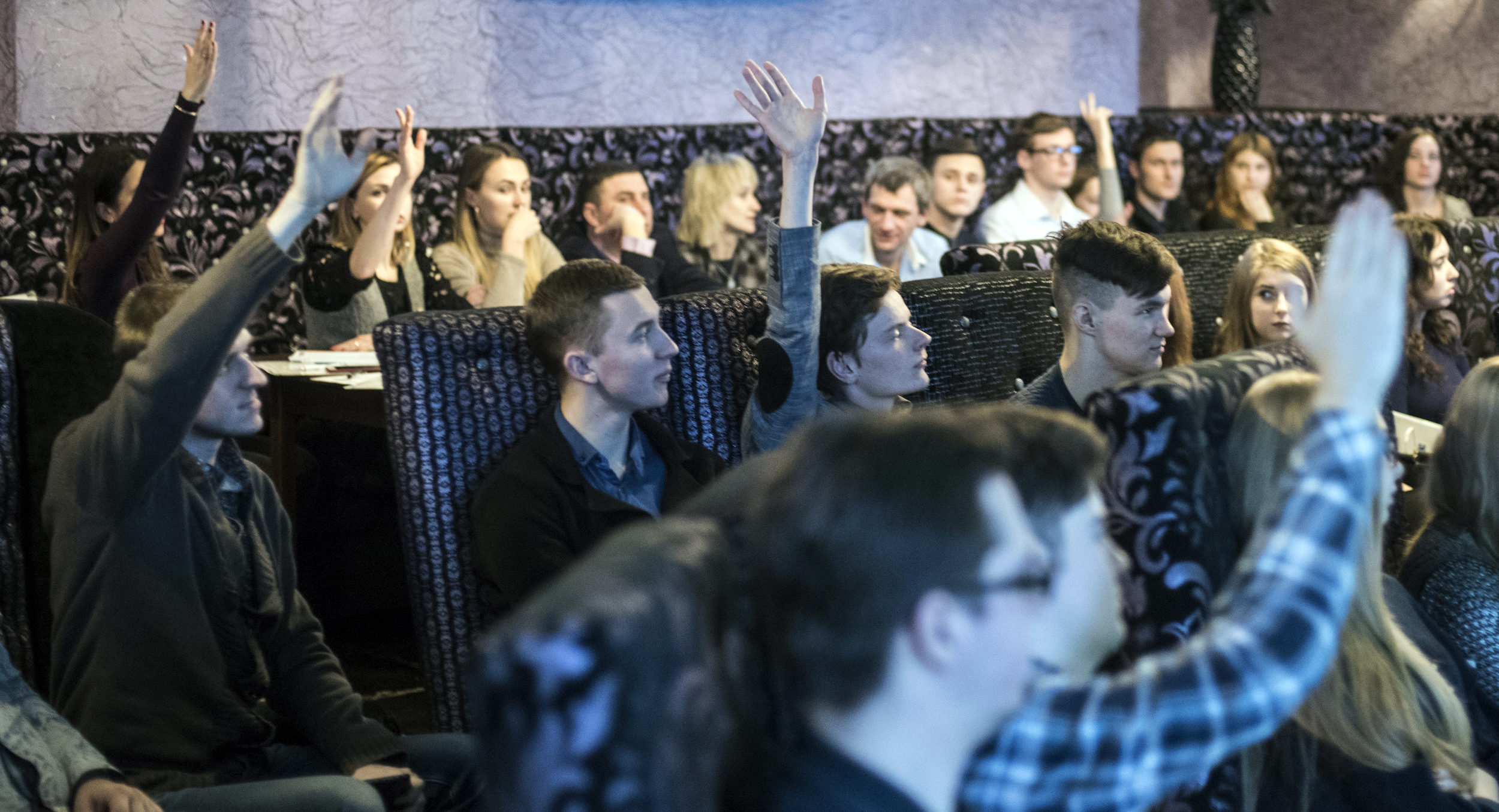 Студенты принимают участие в викторине во время ОБСЕ Café в Луганске, 16 февраля 2018 года.