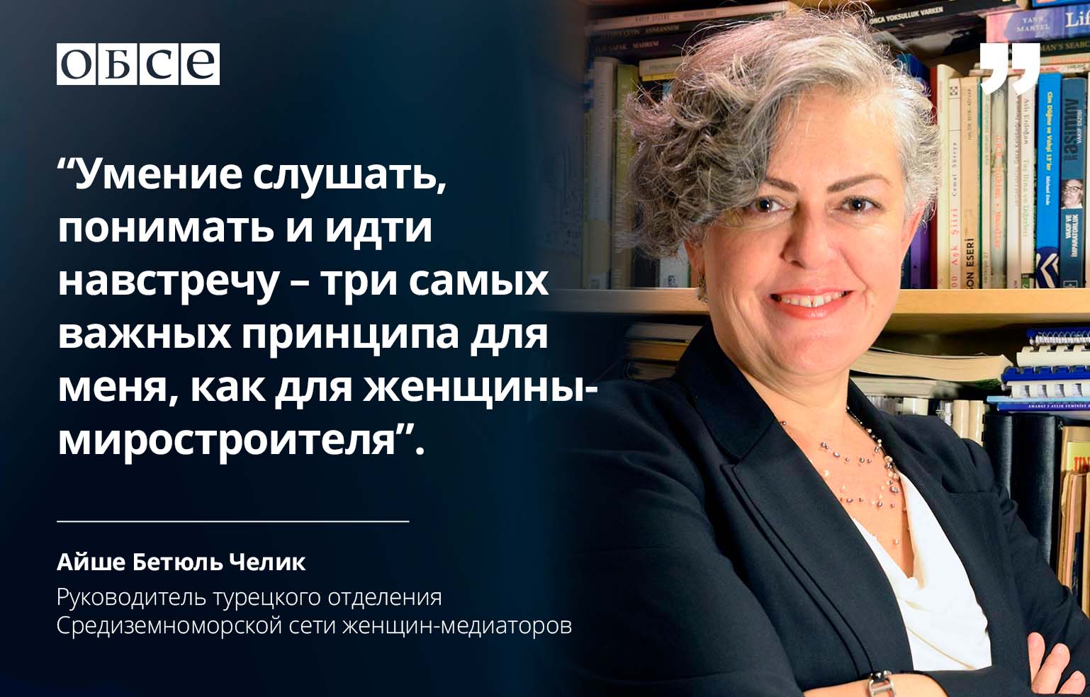 А.Бетюль Челик – основательница и руководитель турецкого отделения Средиземноморской сети женщин-медиаторов. Штатный профессор университета Сабанджи в Стамбуле, преподает и публикует материалы на темы этнических конфликтов, примирения, диалога, вынужденной миграции, гендера и миростроительства.