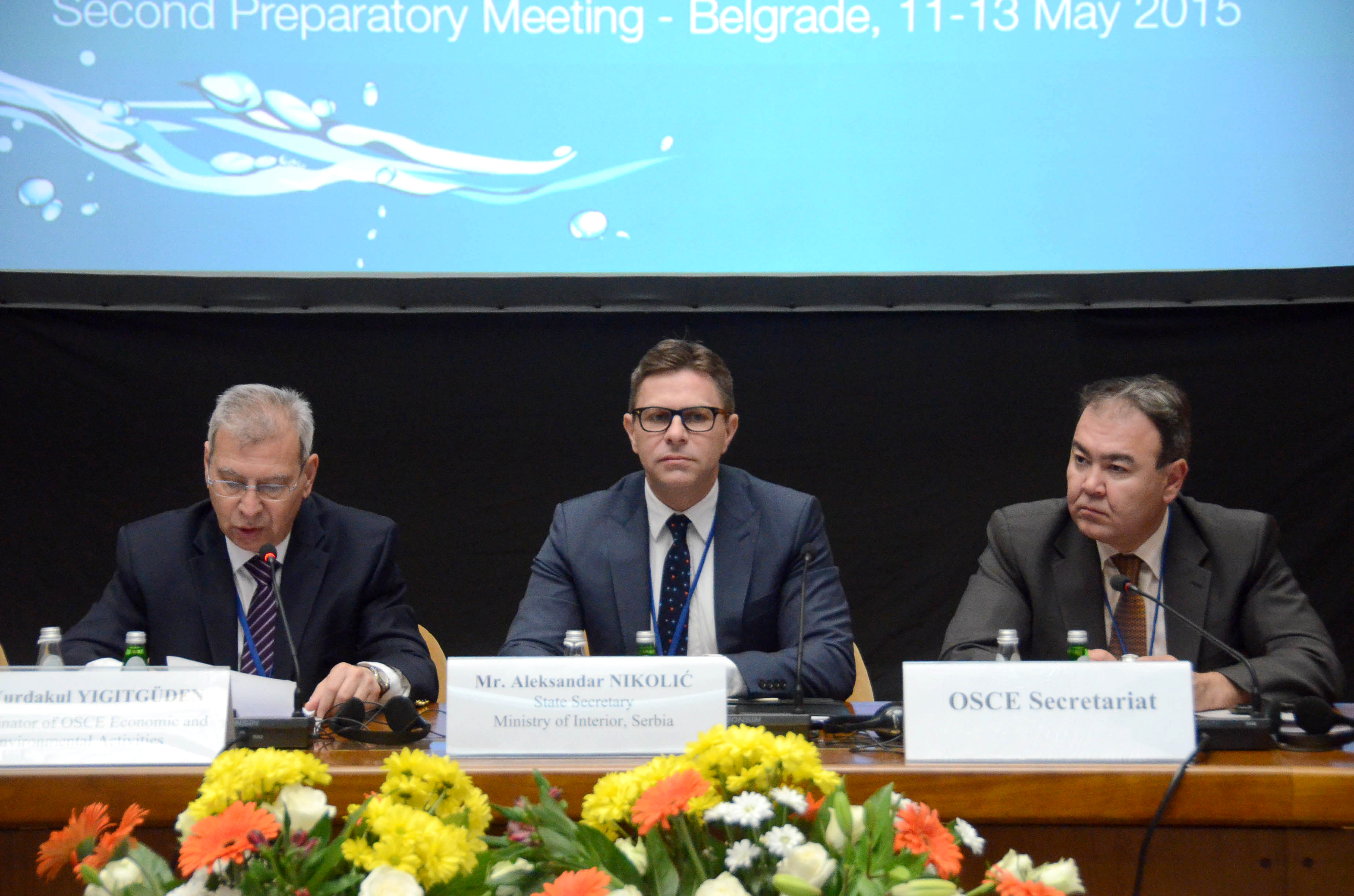 Co-ordinator of OSCE Economic and Environmental Activities, Halil Yurdakul Yigitgüden (l), and Serbia's State Secretary of the Interior Ministry Aleksandar Nikolić (c) at the Second Preparatory Meeting of the 23rd OSCE Economic and Environmental Forum, Belgrade, 12 May 2015.