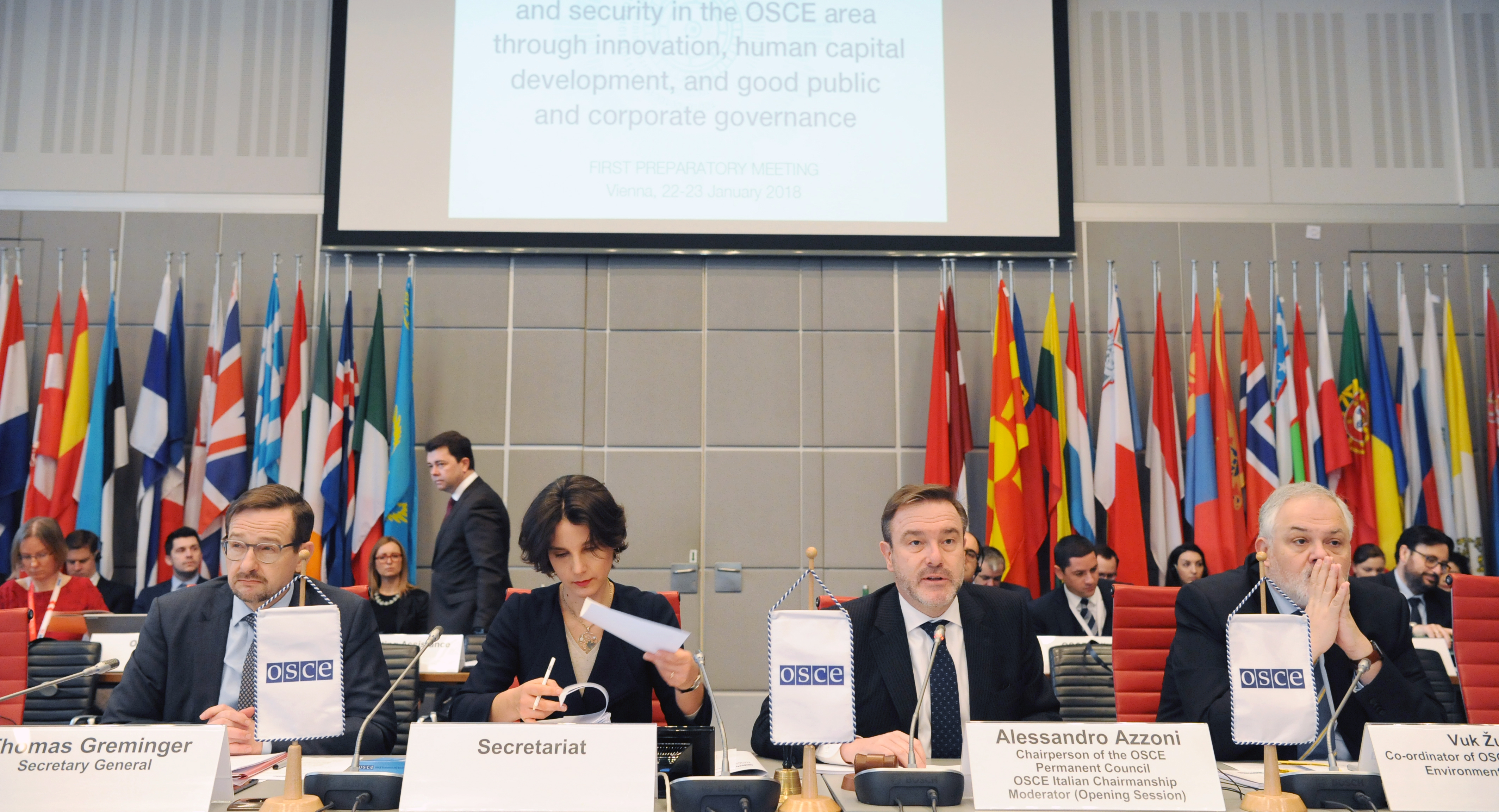 (L-r) OSCE Secretary General Thomas Greminger, Alessandro Azzoni, Chairperson of the OSCE Permanent Council, Vuk Žugić, Co-ordinator of the OSCE Economic and Environmental Activities, at the 1st Preparatory Meeting of the 26th OSCE Economic and Environmental Forum, Vienna, 22 January 2018.
