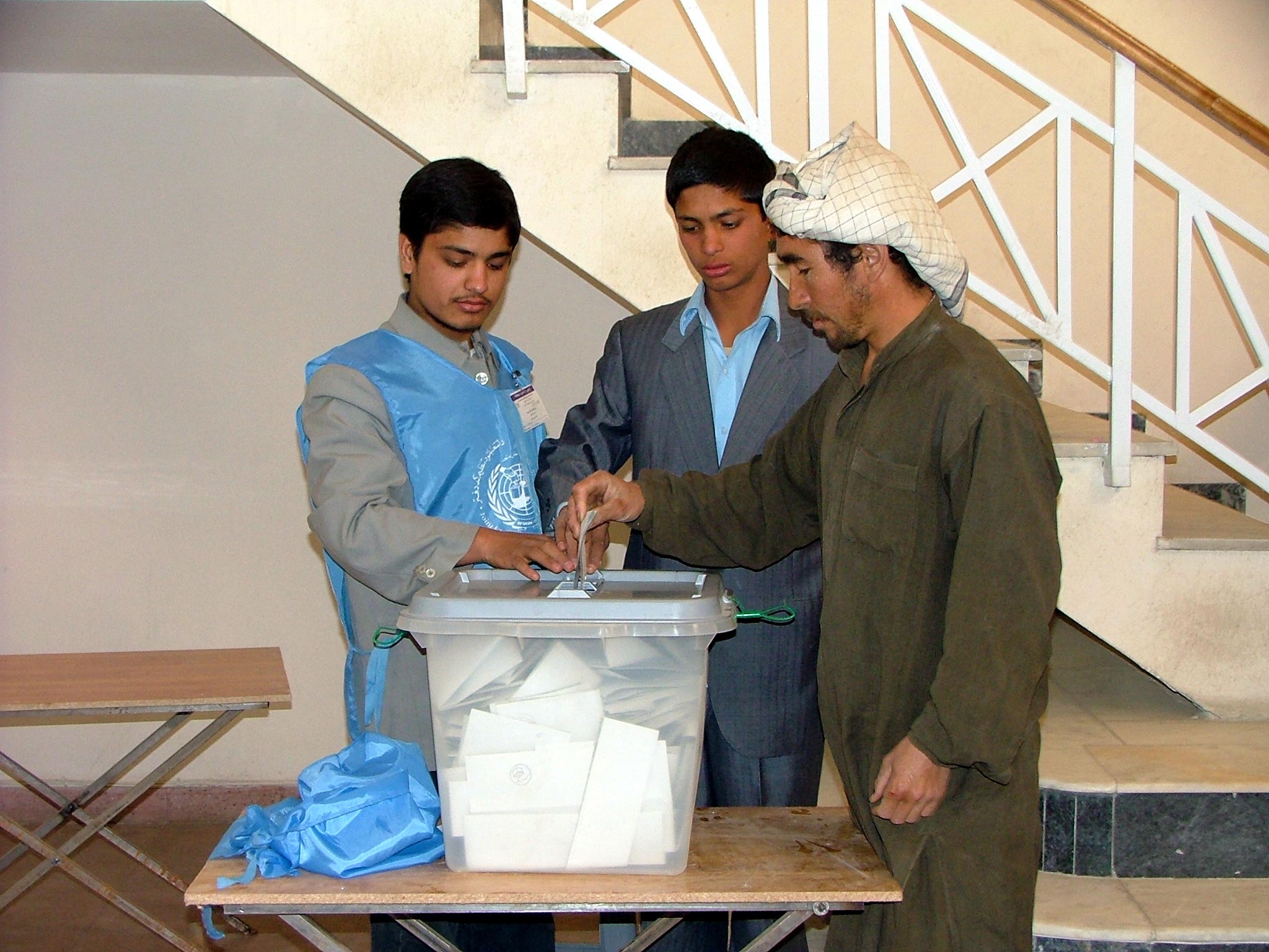 Afghans cast ballots at a polling station during the presidential election, in Kabul, 9 October 2004.