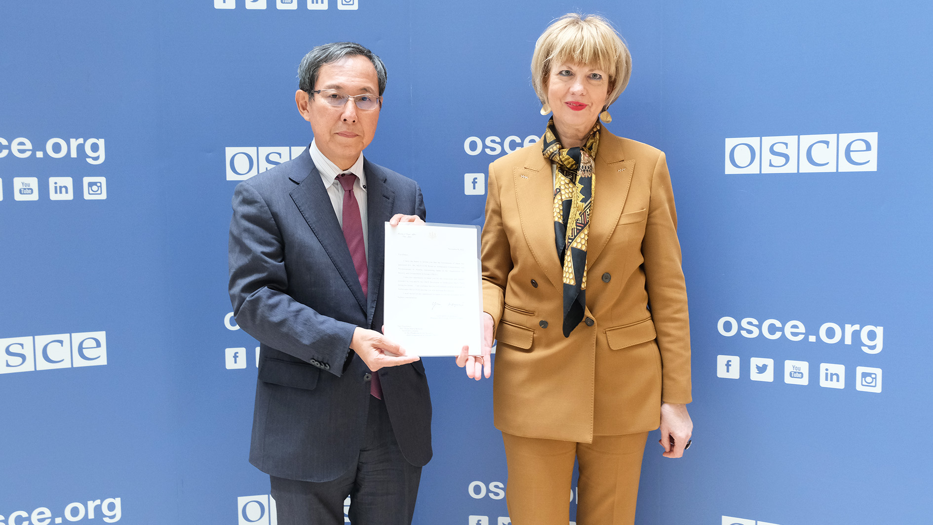 H.E. Ryuta Mizuuchi, Ambassador and Permanent Representative of Japan to the OSCE, with the OSCE Secretary General Helga Maria Schmid, Vienna, 20 January 2023.