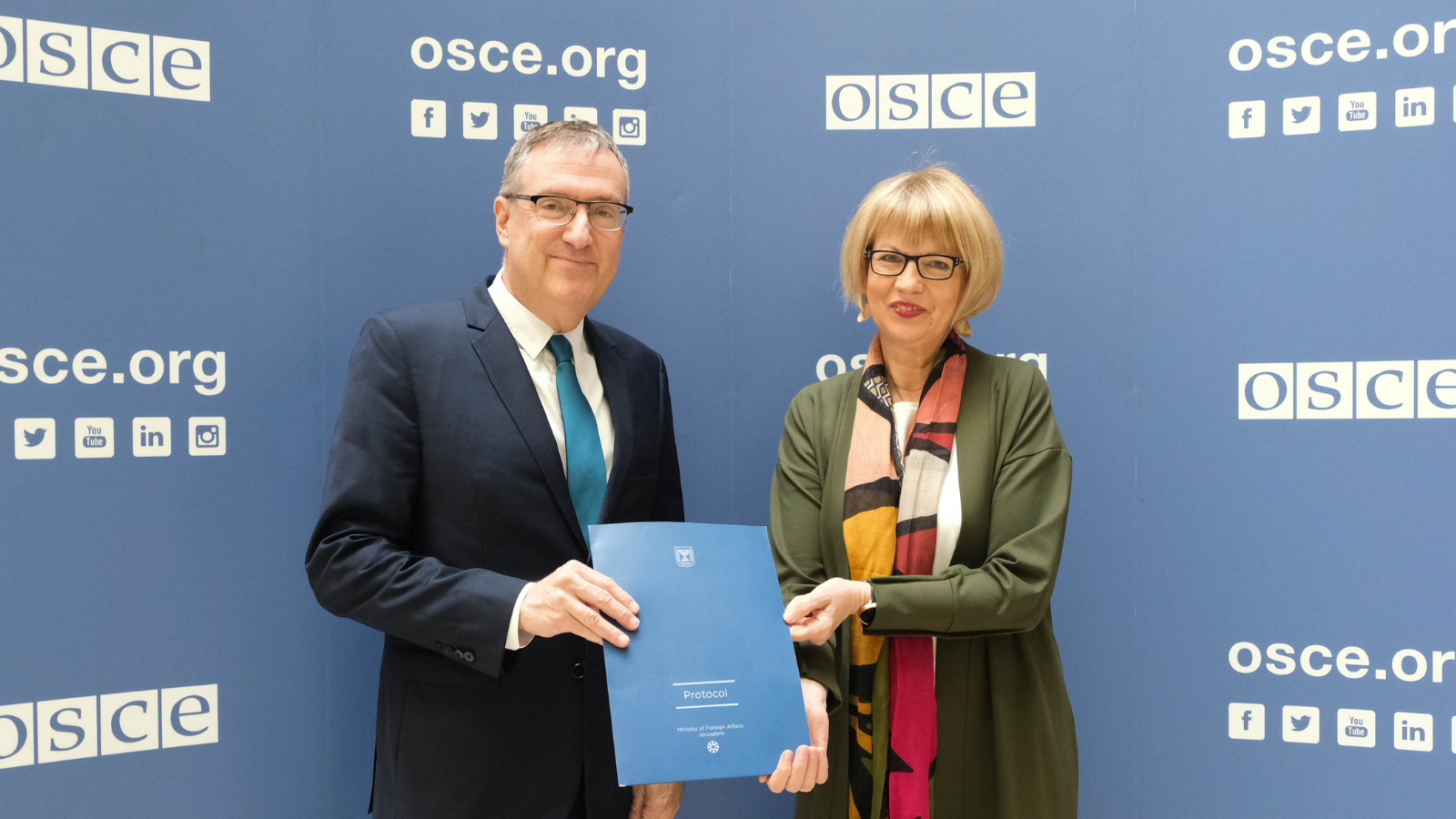 H.E. David Roet, Ambassador and Permanent Representative of Israel to the OSCE, with the OSCE Secretary General Helga Maria Schmid, Vienna, 6 October 2023.