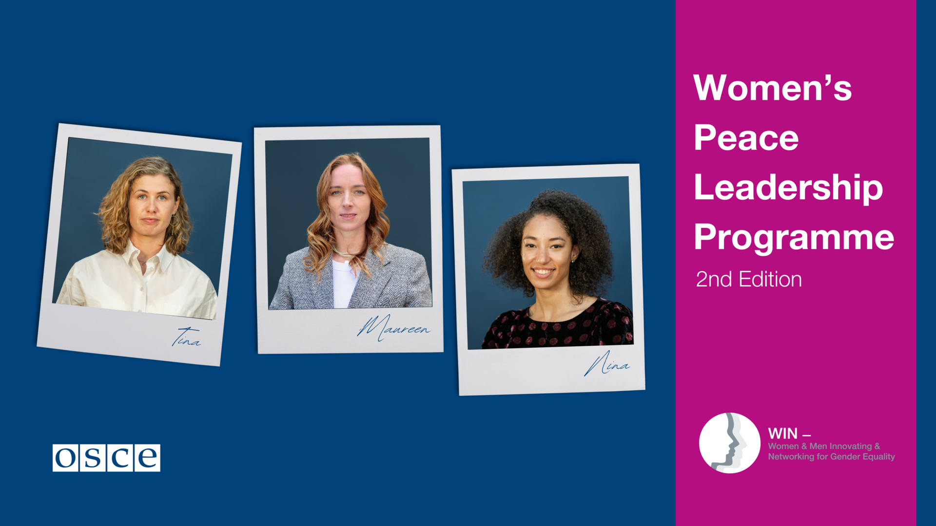 Tina Kurath, Maureen Walschot and Nina Ullom are three of the 16 mentees from around the OSCE region and Afghanistan, participating in the OSCE Women’s Peace Leadership Programme 2023-2024, an initiative of the OSCE Secretary General Helga Maria Schmid. The Programme aims to strengthen the ability of women to meaningfully engage and influence peace processes at all levels. It is a part of the OSCE’s flagship project WIN for Women and Men, which covers the Networking platform for Women Leaders including Peacebuilders and Mediators. The WIN project works with OSCE-supported networks and gives rise to new networks, fostering women’s participation and leadership, as well as broader men’s engagement in achieving gender equality.