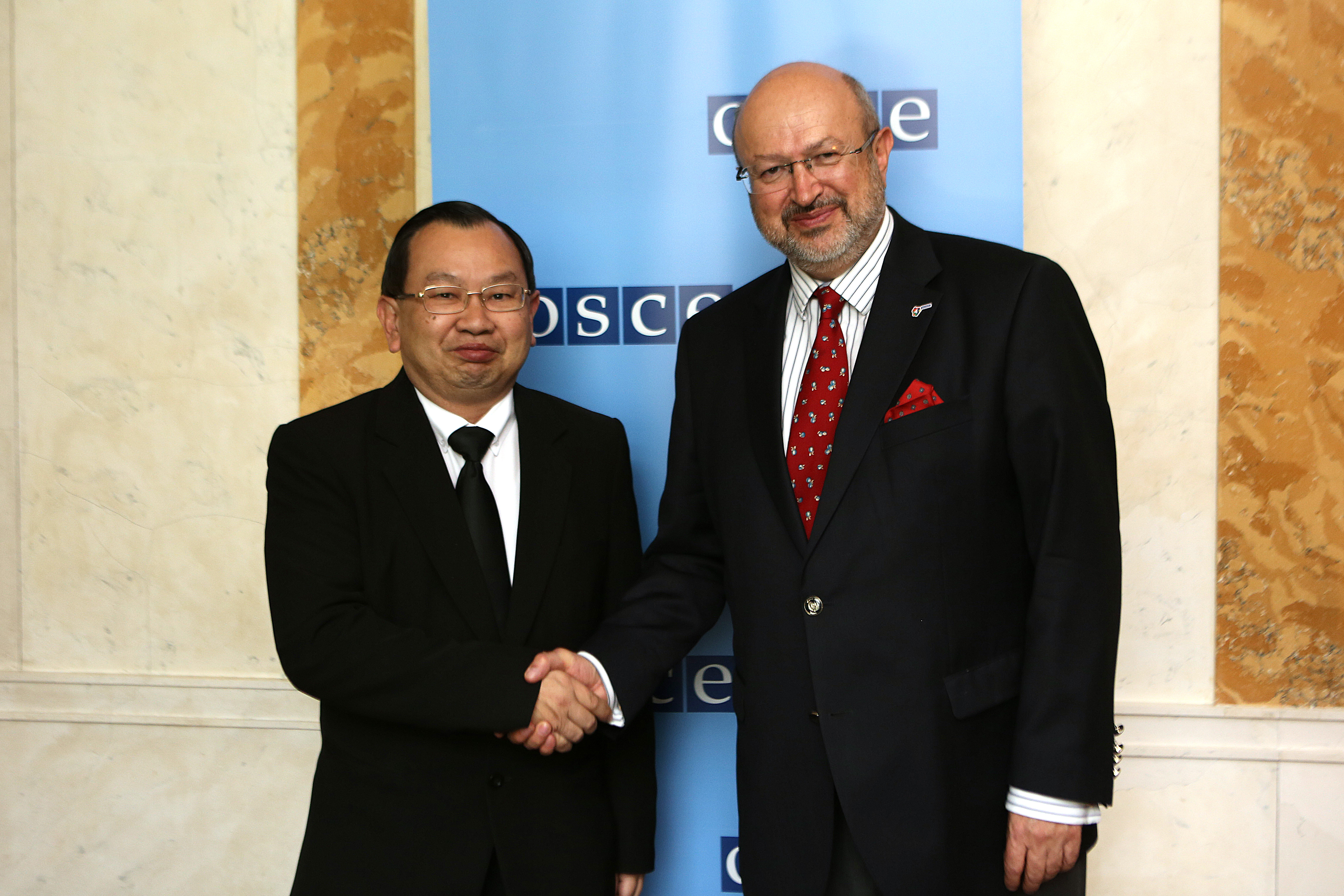 H.E. Mr. Songsak Saicheua, Ambassador Extraordinary and Plenipotentiary of the Kingdom of Thailand to the Republic of Austria and Permanent Representative to the International Organizations in Vienna, with OSCE Secretary General Lamberto Zannier, Vienna, 23 May 2017.