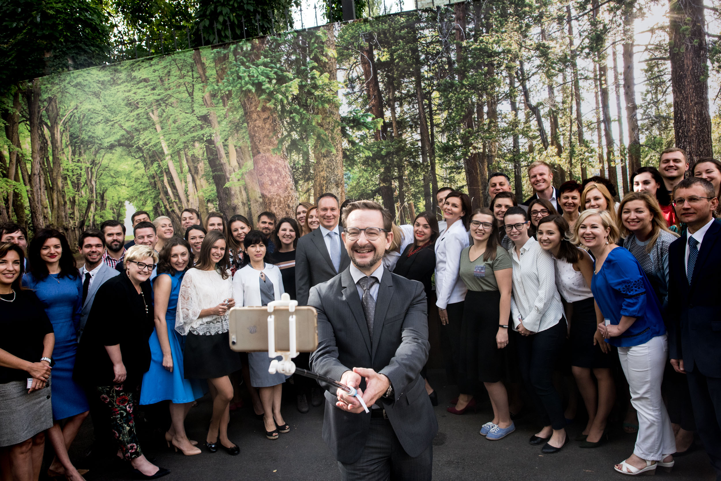 Staff members from the OSCE Project Co-ordinator in Ukraine take a selfie with the OSCE Secretary General Thomas Greminger, during his visit to Kyiv, 14 September 2017.