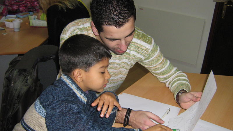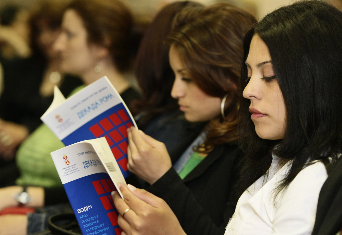 Roma health mediators read a publication on the Roma Decade during a conference on implementation of the action plan on Roma health, Belgrade, 7 May 2009.