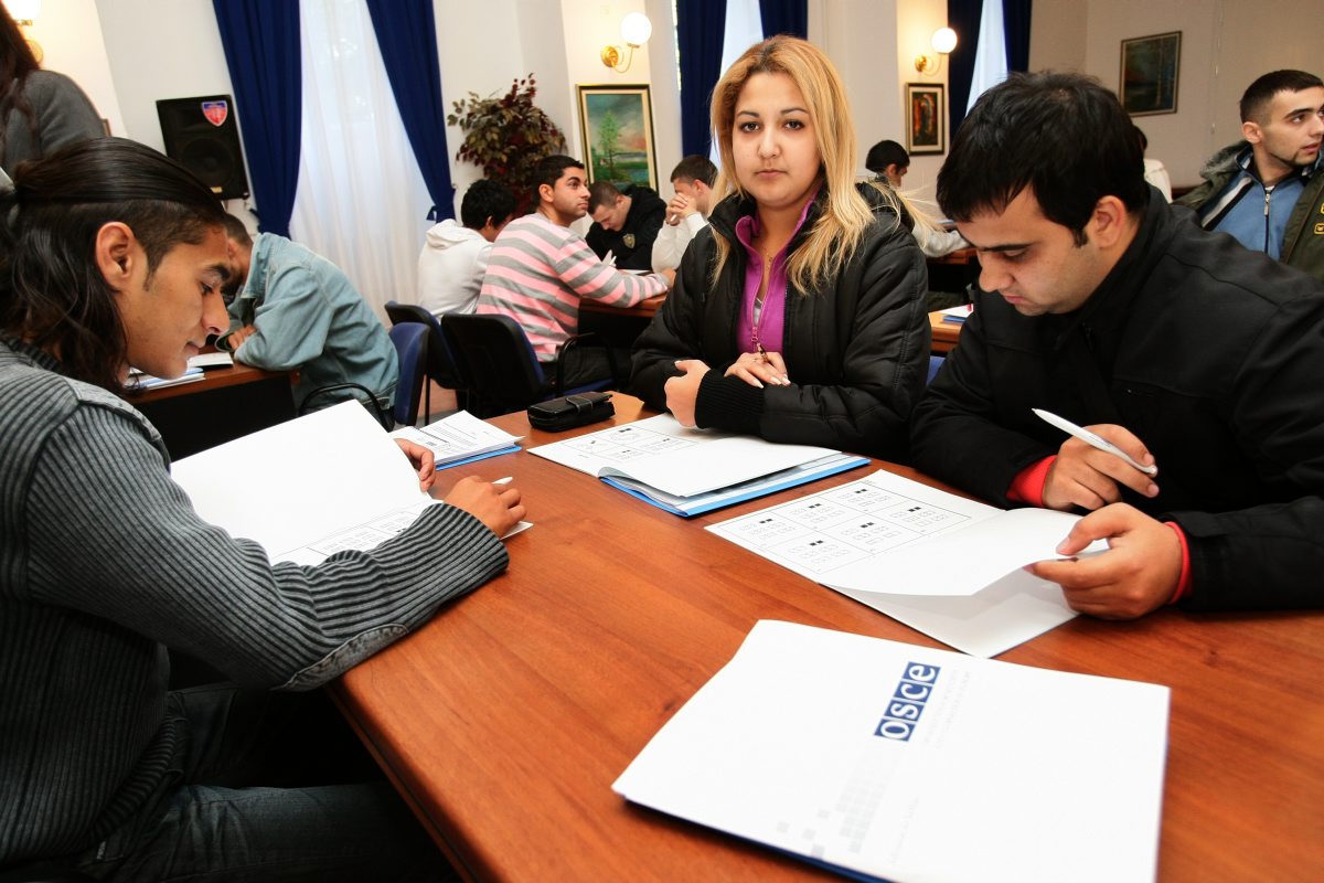 Prospective Roma applicants to the Basic Police Training Centre in Sremska Kamenica look at information material during a study visit, 21 October 2009.