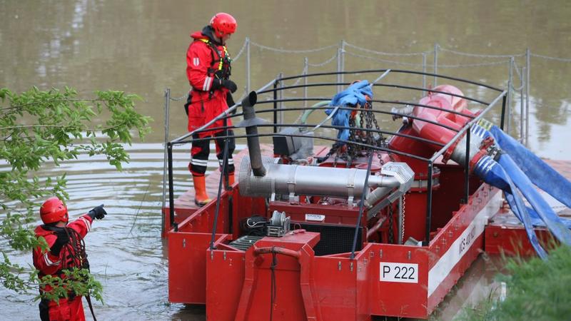 Rescue team drains water using water pumping equipment on Mlava river, Kostolac, 19 May 2014.