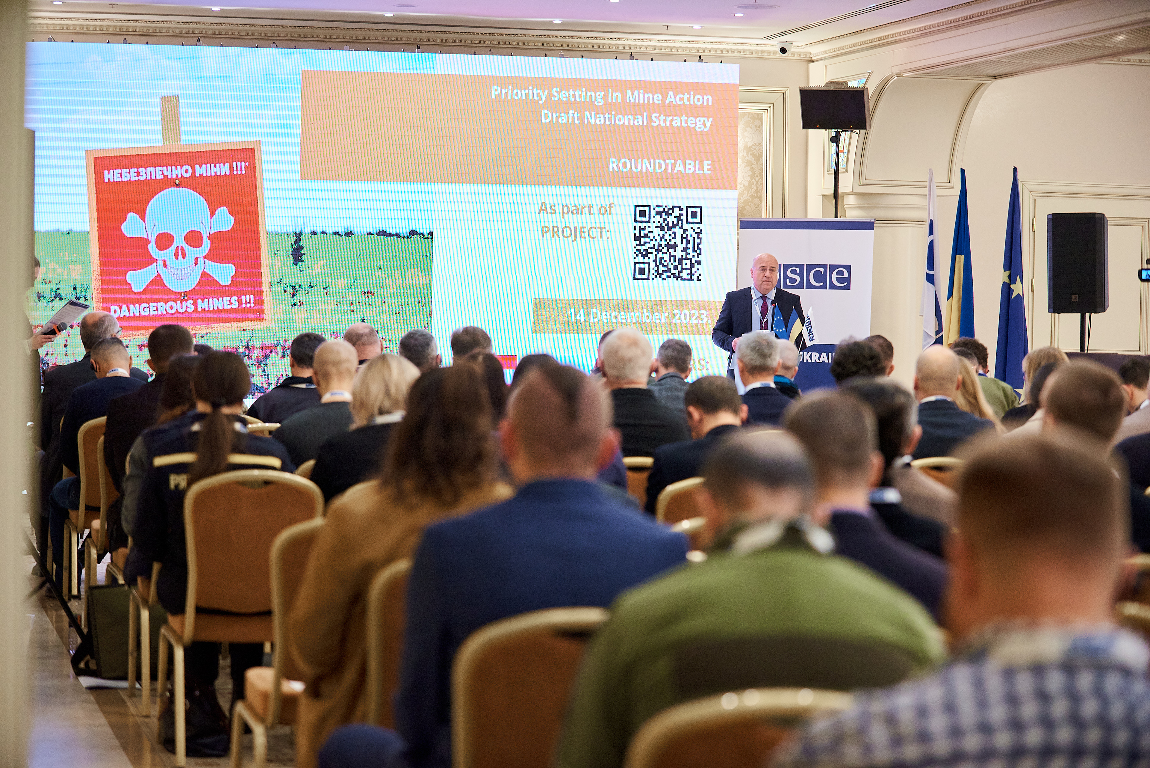 Marcel Peško, Special Representative of the OSCE Chairmanship – Project Coordinator in Ukraine, addresses participants of the roundtable on priority setting in mine action. 14 December 2023.