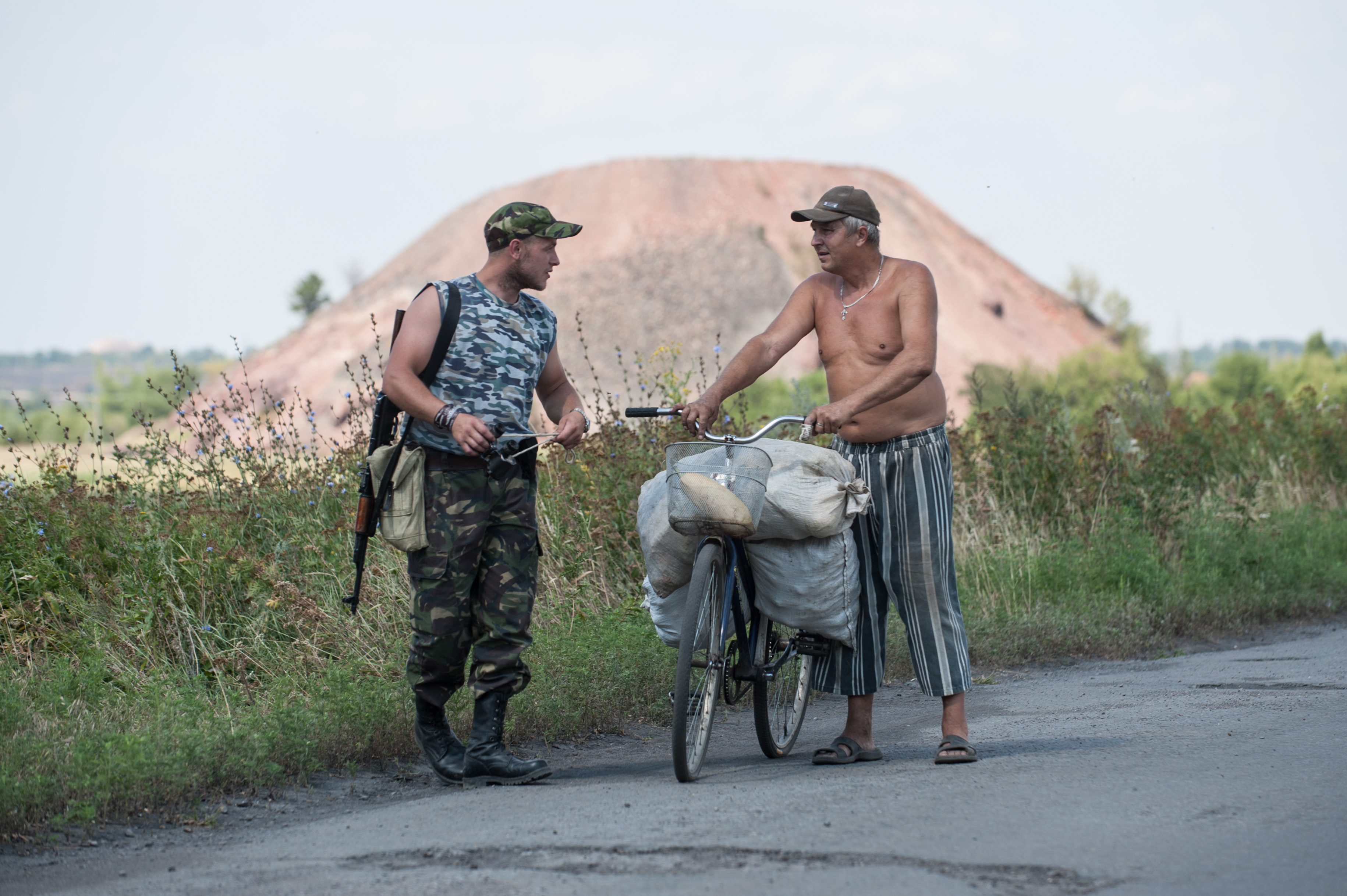 Озброєний чоловік розмовляє з місцевим жителем біля місця падіння МН17, 5 серпня 2014 року.