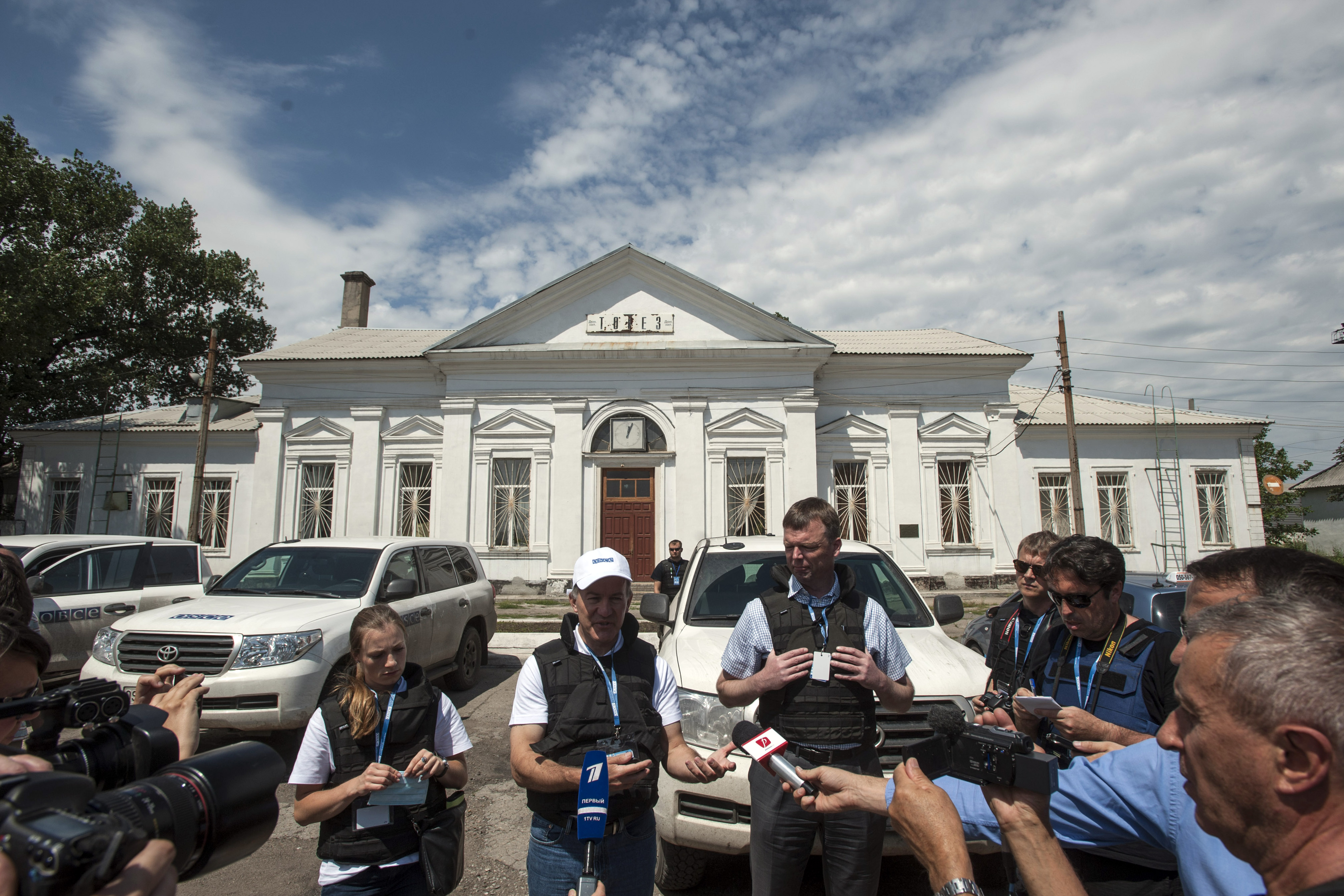 Members of the OSCE Special Monitoring Mission to Ukraine give a press briefing outside Torez railway station, where many bodies from the crash are being stored in special train compartments.